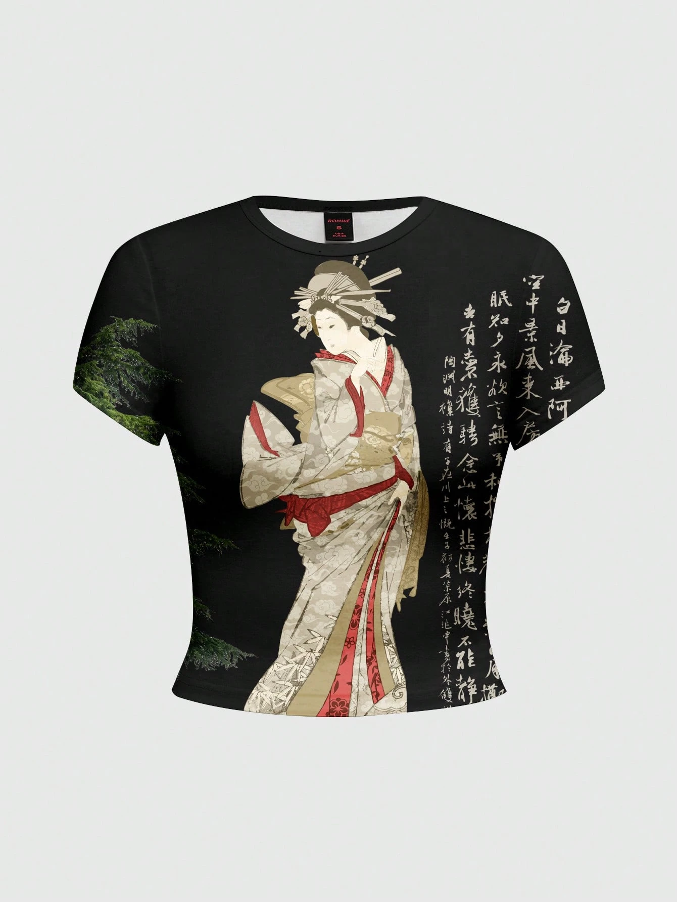ROMWE Avant Camiseta sexy con estampado completo de figura de caligrafía china punk linda, lema y bosque de bambú