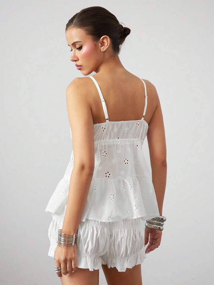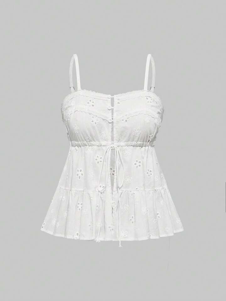 ROMWE Avant Camiseta sin mangas de mujer con acabado de volantes y cordón, de semitraslúcido con bordado estilo Sicilia