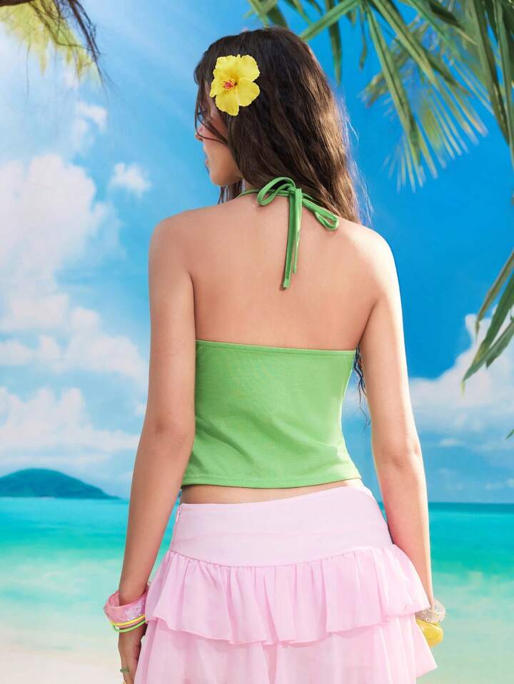 ROMWE Avant Top de tirantes de mujer con cuello de halter, estilo casual de vacaciones en la playa, con aplicaciones de flores y cristales