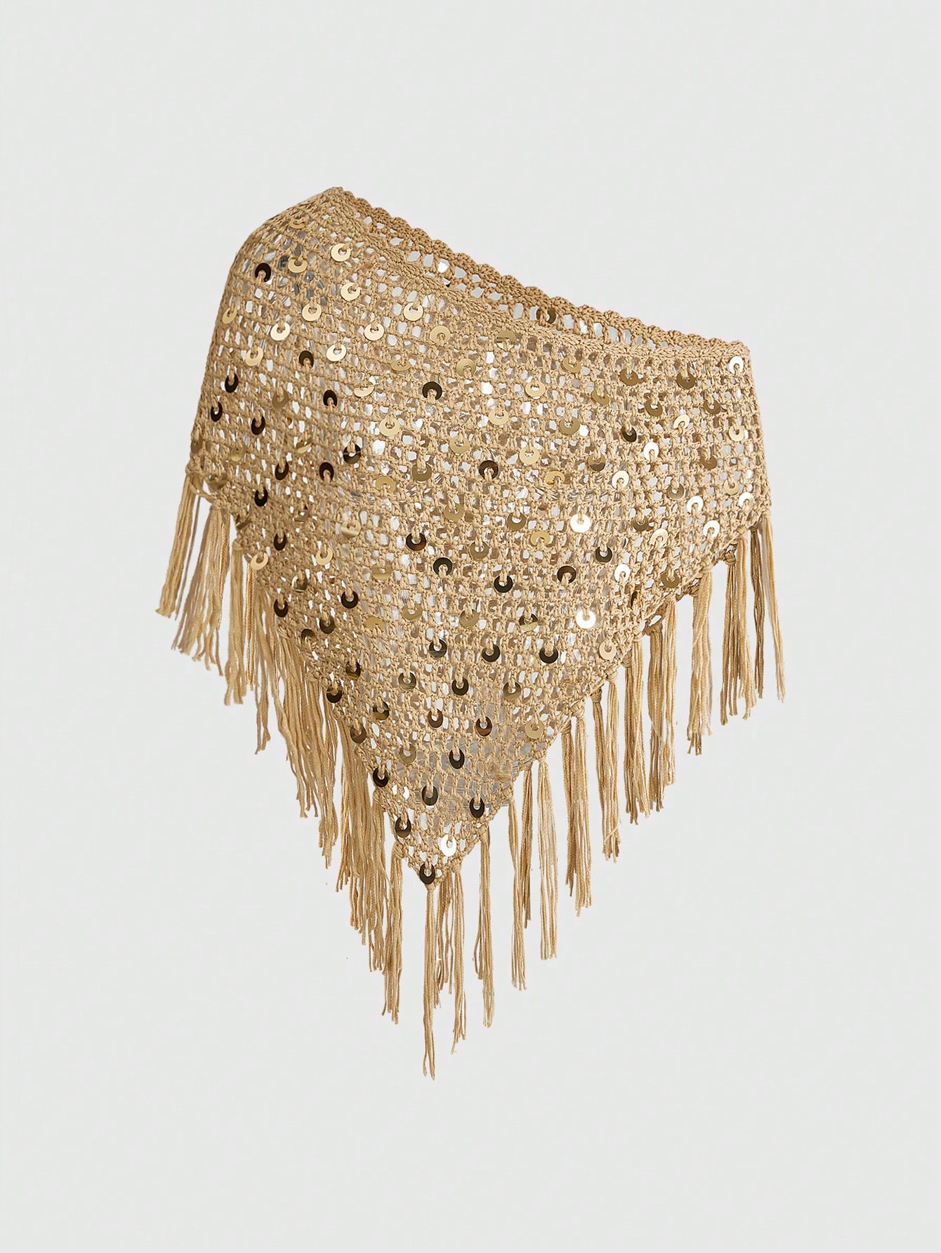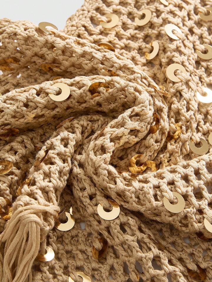 ROMWE Avant Chal de ganchillo con flecos de lentejuelas marrones, estilo vacaciones