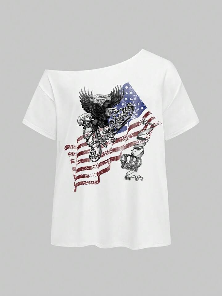 ROMWE Avant Camiseta blanca vintage y sexy con estampado asimétrico de bandera estadounidense y águila, informal y de talla grande para uso en la calle durante el verano