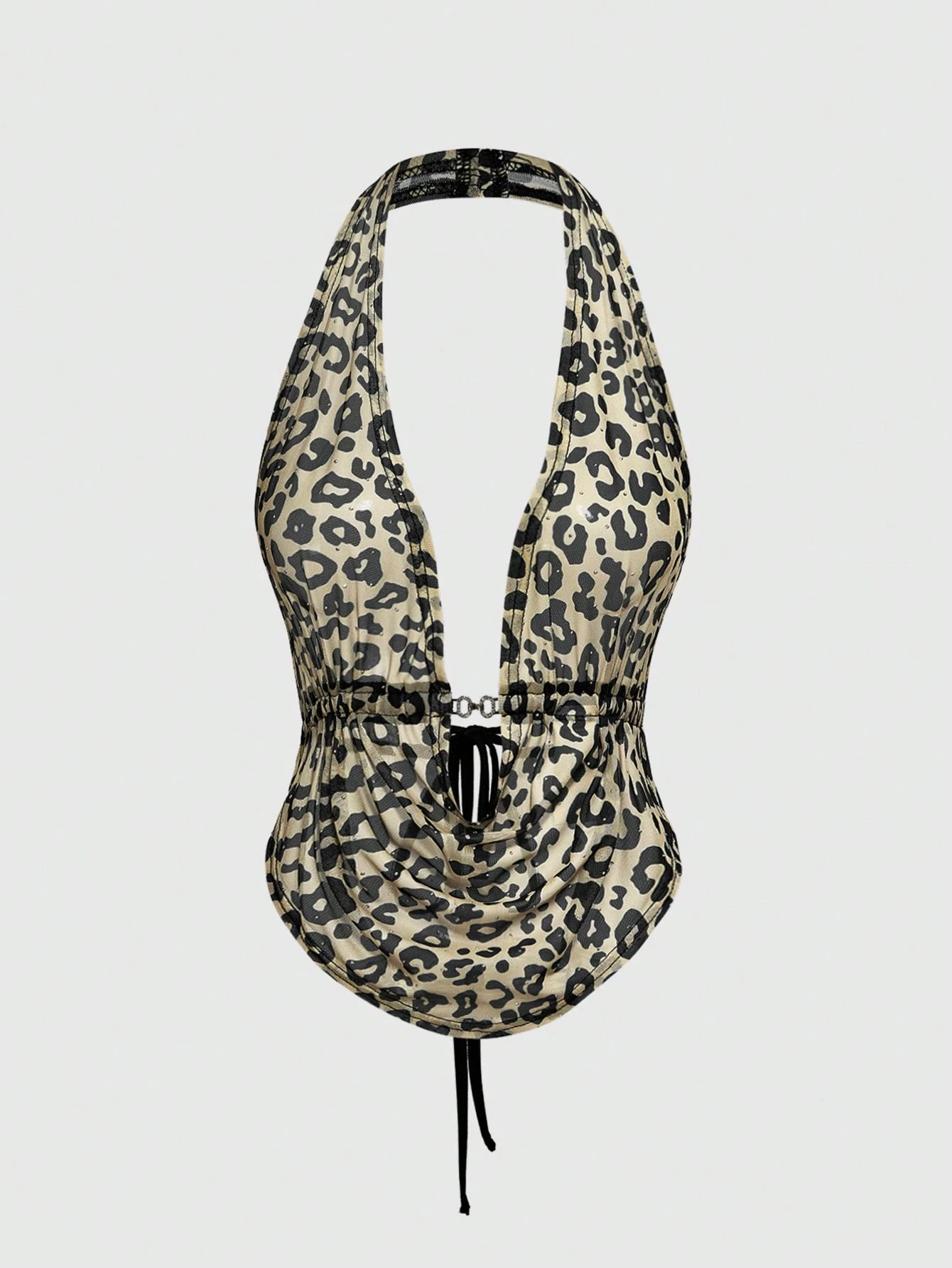 ROMWE Avant Camiseta de tirantes con escote pronunciado, de estilo vintage Y2K del milenio, con estampado de leopardo y detalles de cristal en la malla