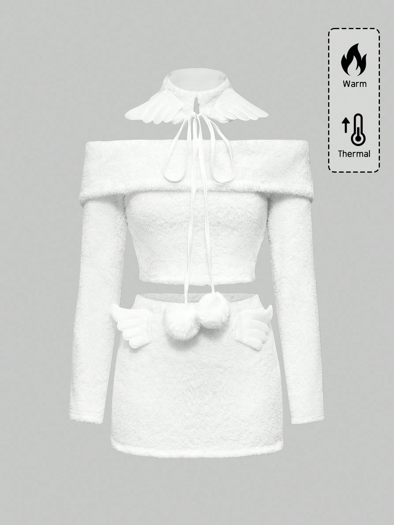 ROMWE Avant Conjunto de 3 piezas de mujer para otoño/invierno con top corto ajustado de un hombro plegable de unicolor elegante y sencillo, falda con diseño de alas 3D y cuello con pompón y textura esponjosa