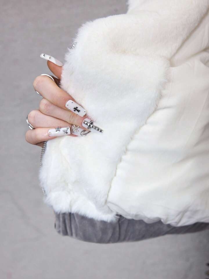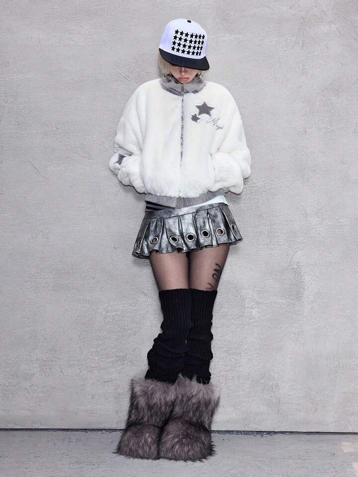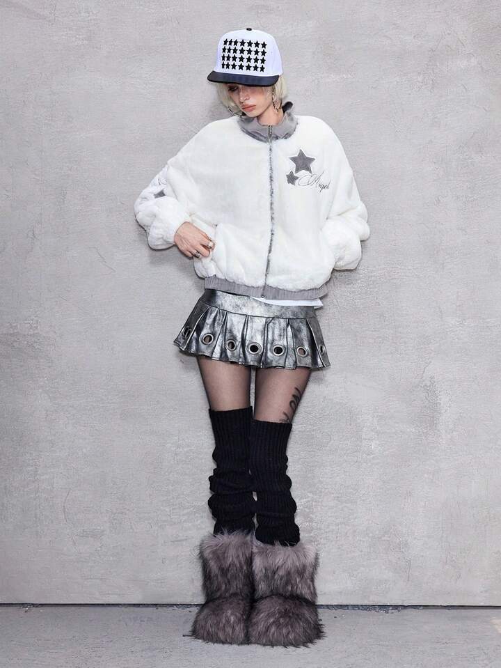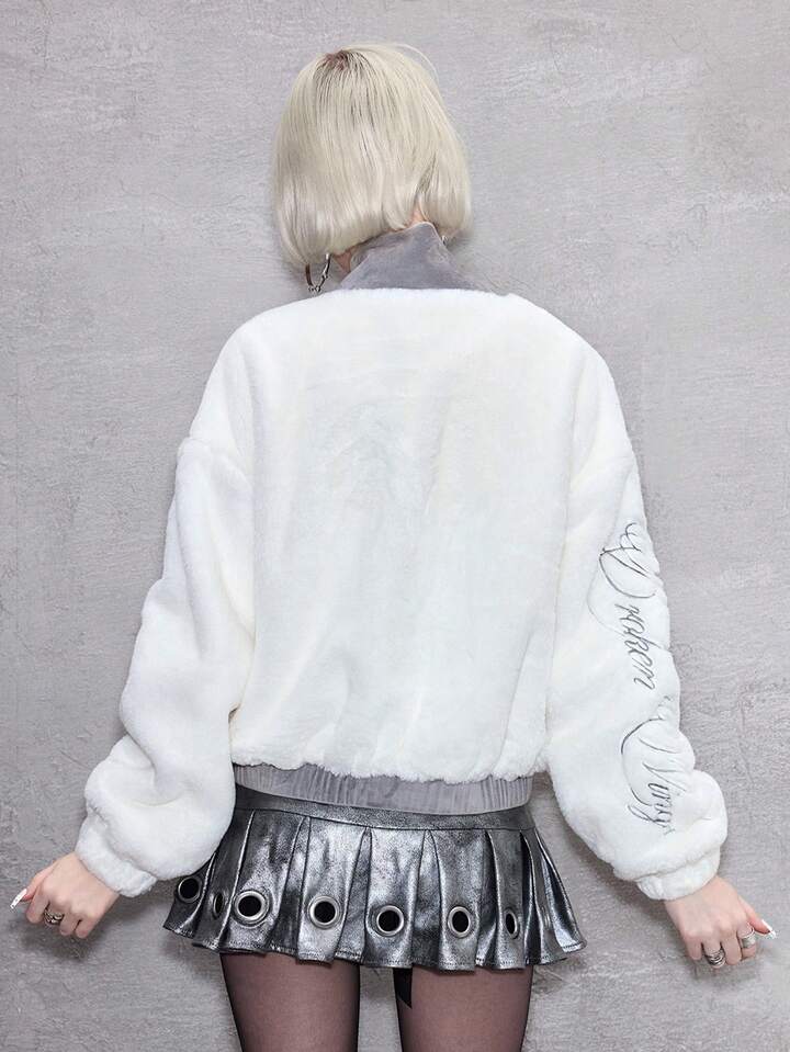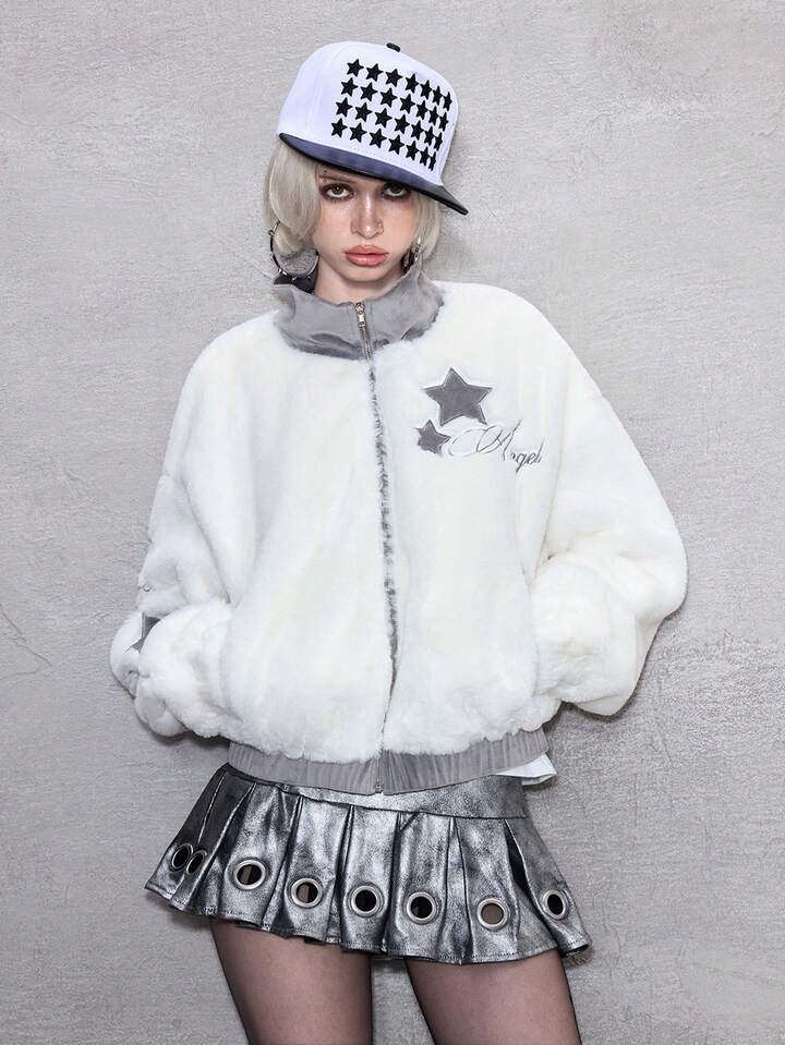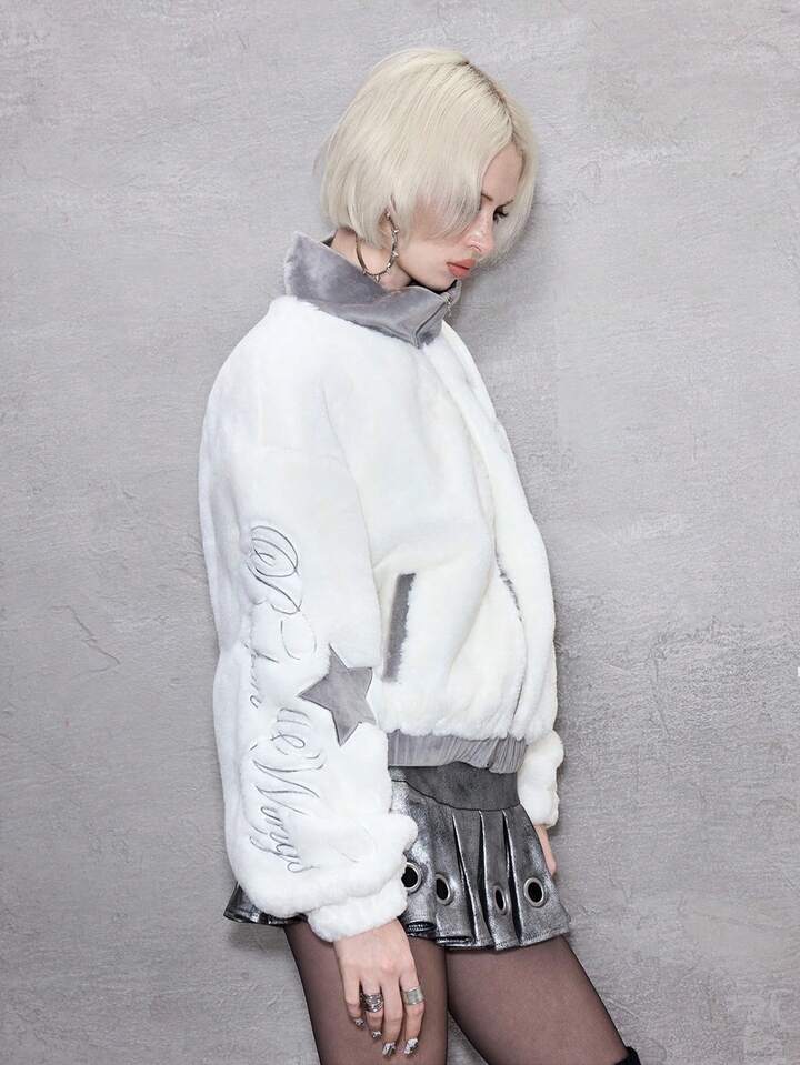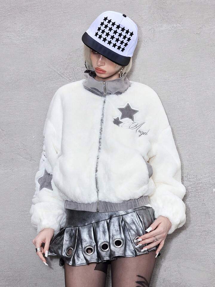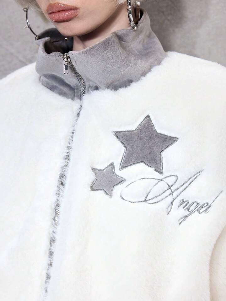 ROMWE Avant Chaqueta con cremallera, cuello de piel sintética y bordado de letras y estrellas para mujer, para otoño/invierno