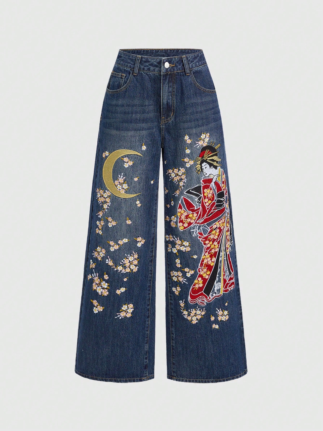 ROMWE Avant Jeans anchos y sueltos de uso diario y casual con bordado de caracteres japoneses para mujeres