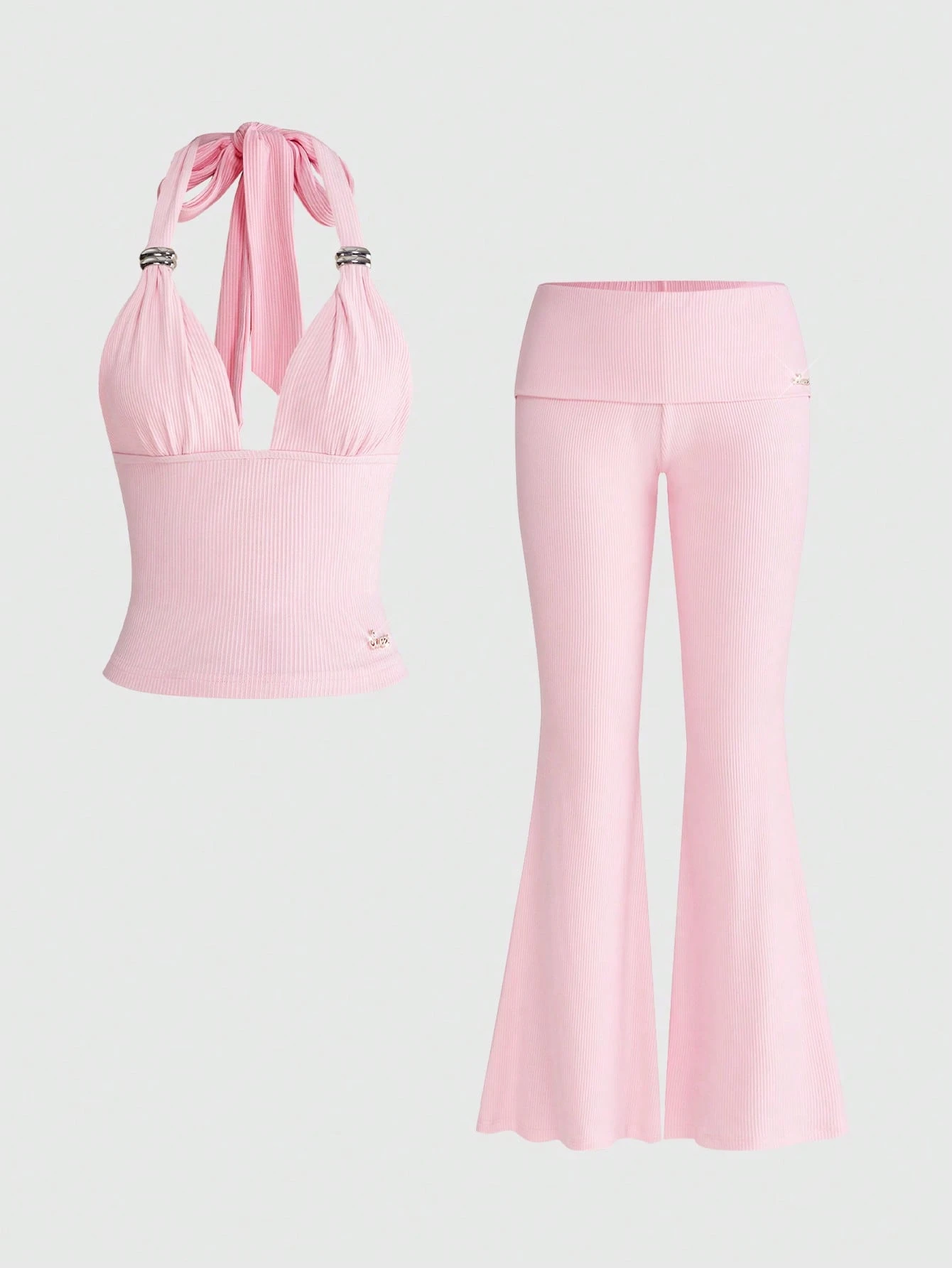 ROMWE Avant Conjunto de 2 piezas de top halter sin espalda casual y sexy con pantalones acampanados, para primavera/verano