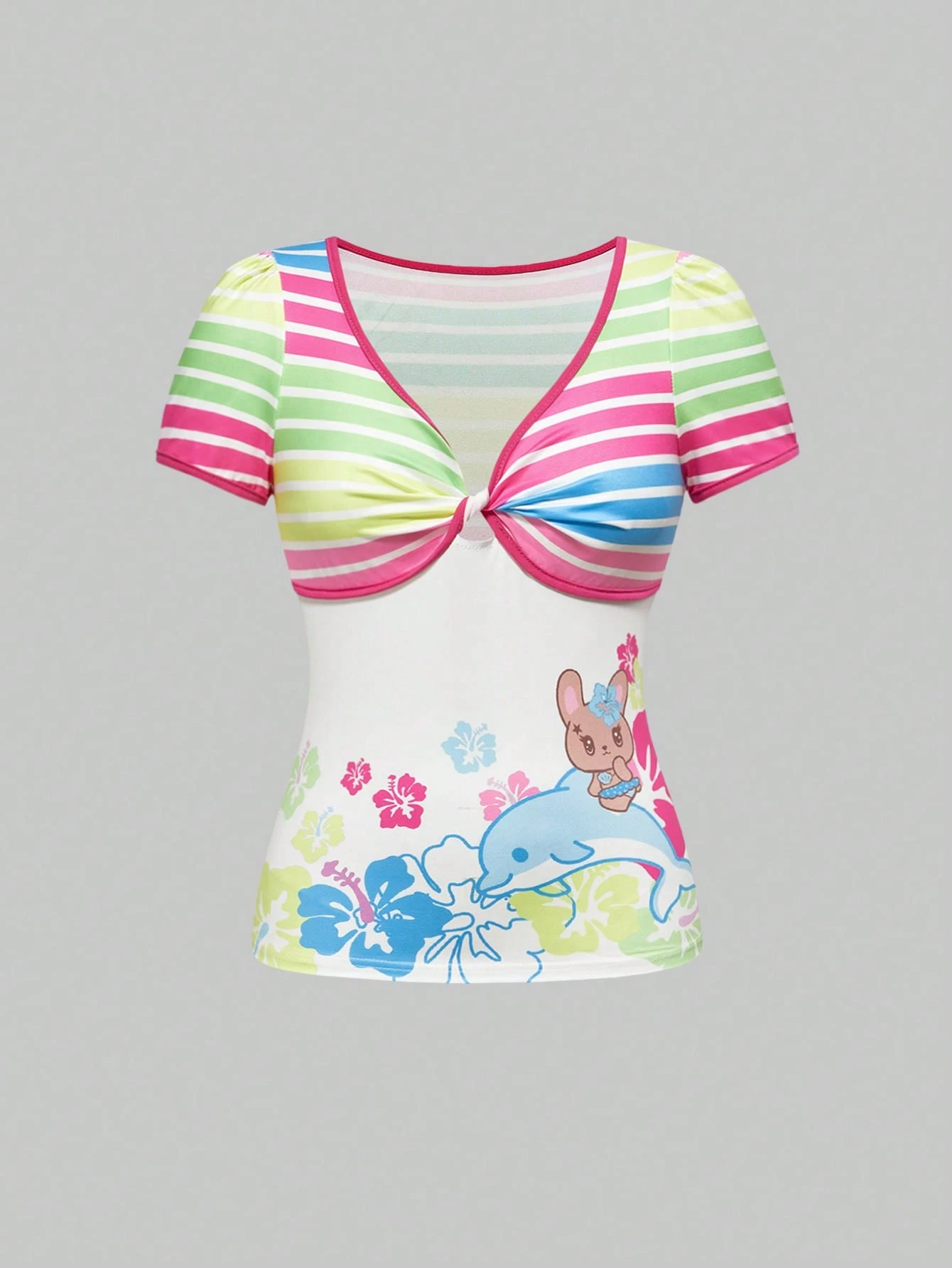 ROMWE Avant Camiseta ajustada de manga corta con cuello de nudo y estampado floral y de rayas para mujer