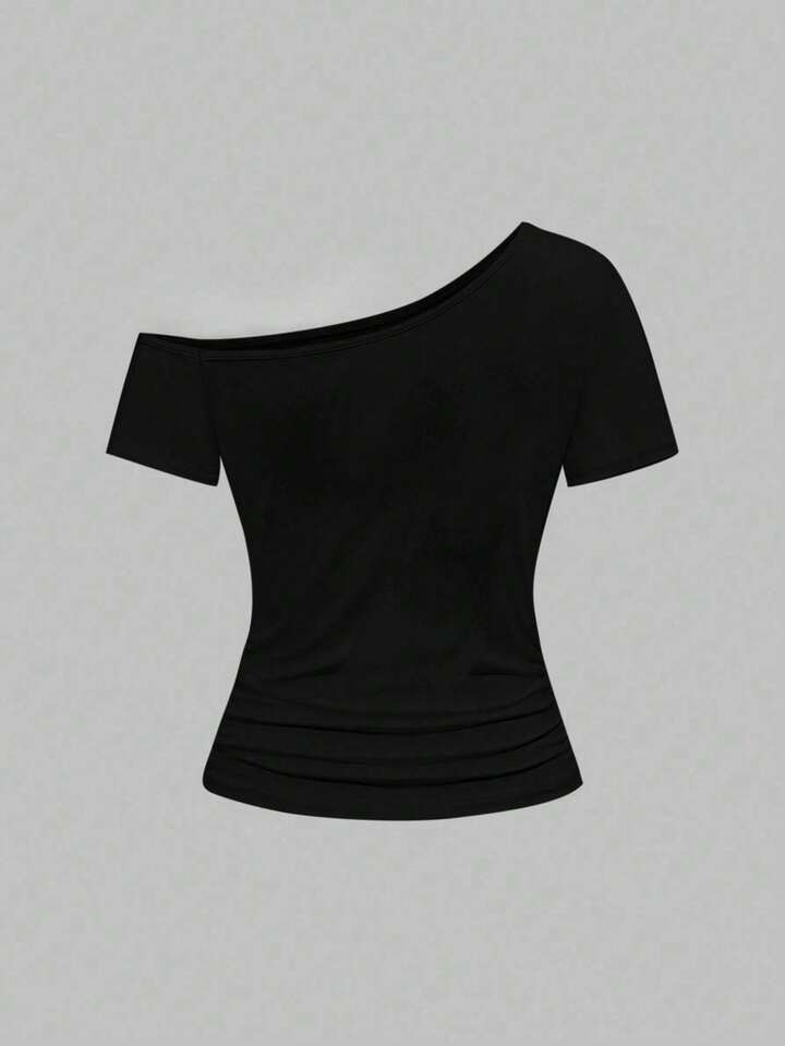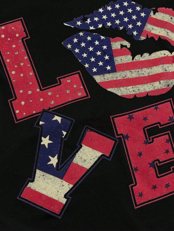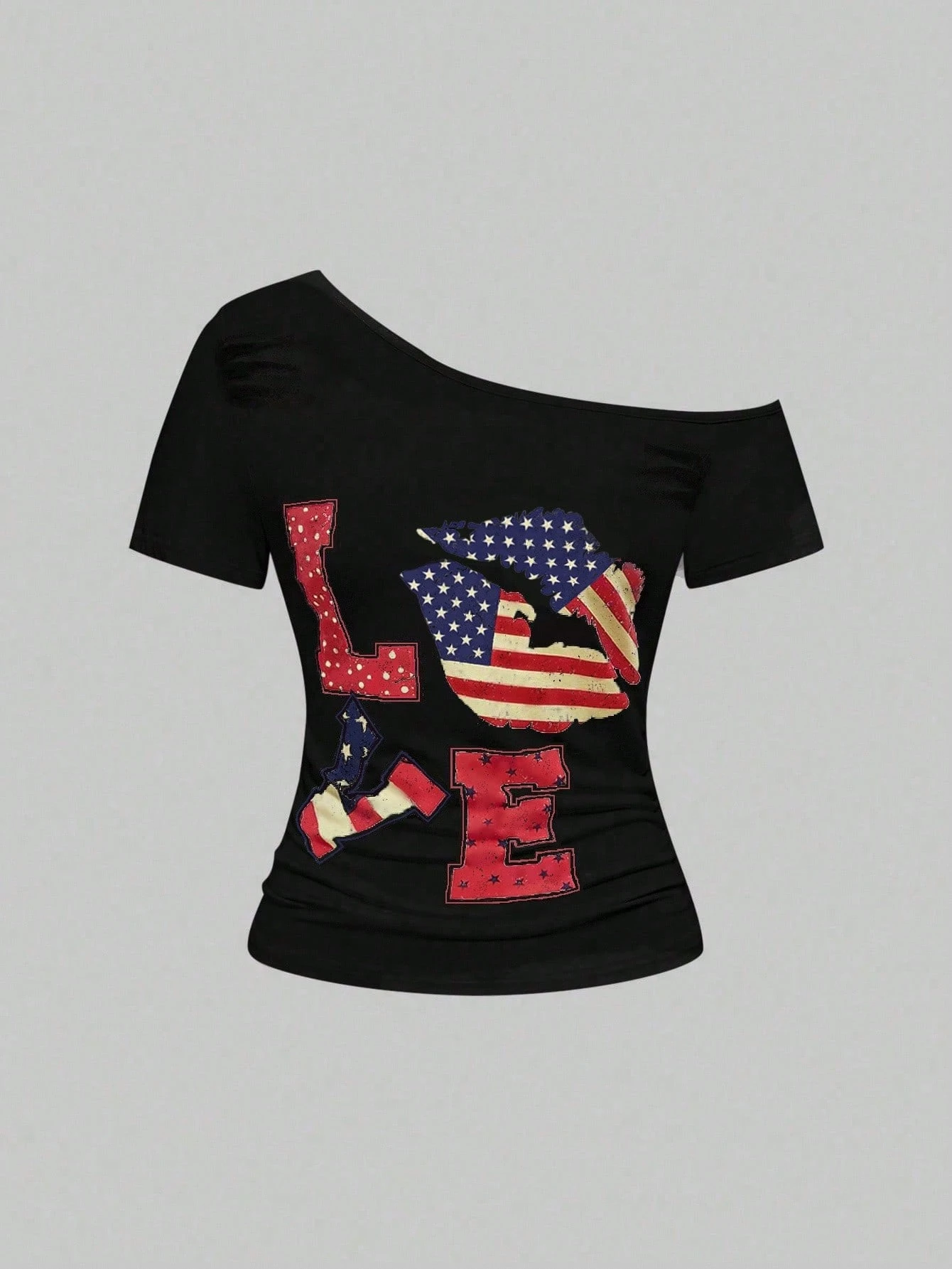 ROMWE Avant Camiseta de verano casual asimétrica con estampado de bandera y labios para mujer, estilo K-pop