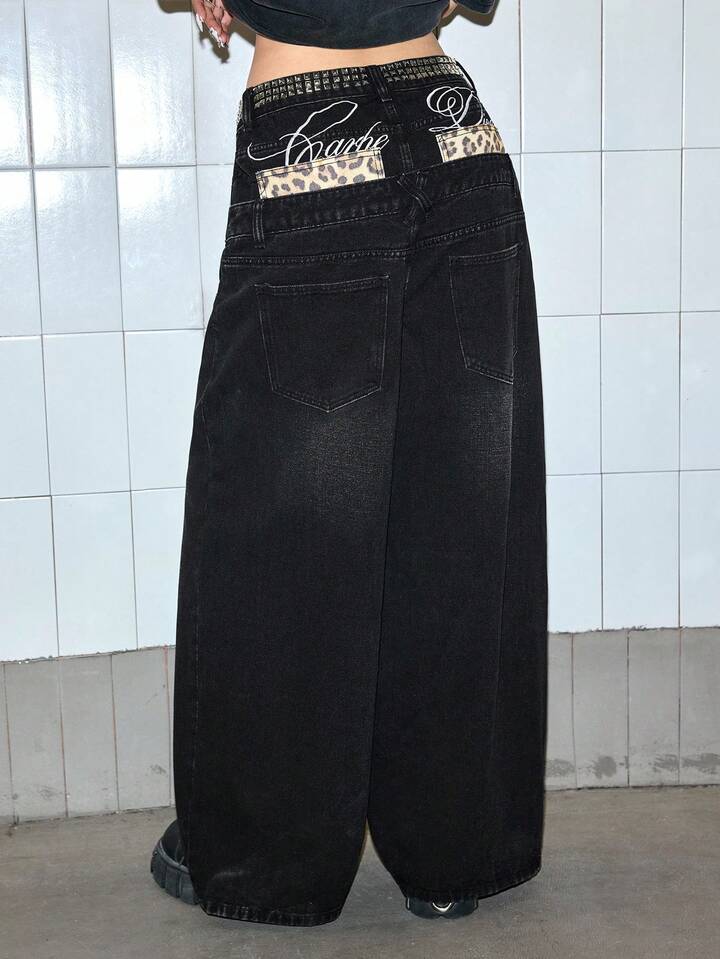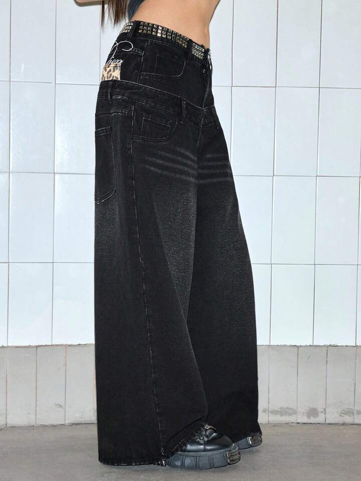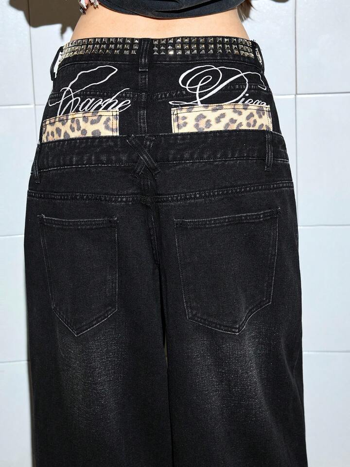 ROMWE Avant Jeans de pierna ancha de talle bajo con estampado de leopardo y bordado de letras con decoración de remaches para mujer