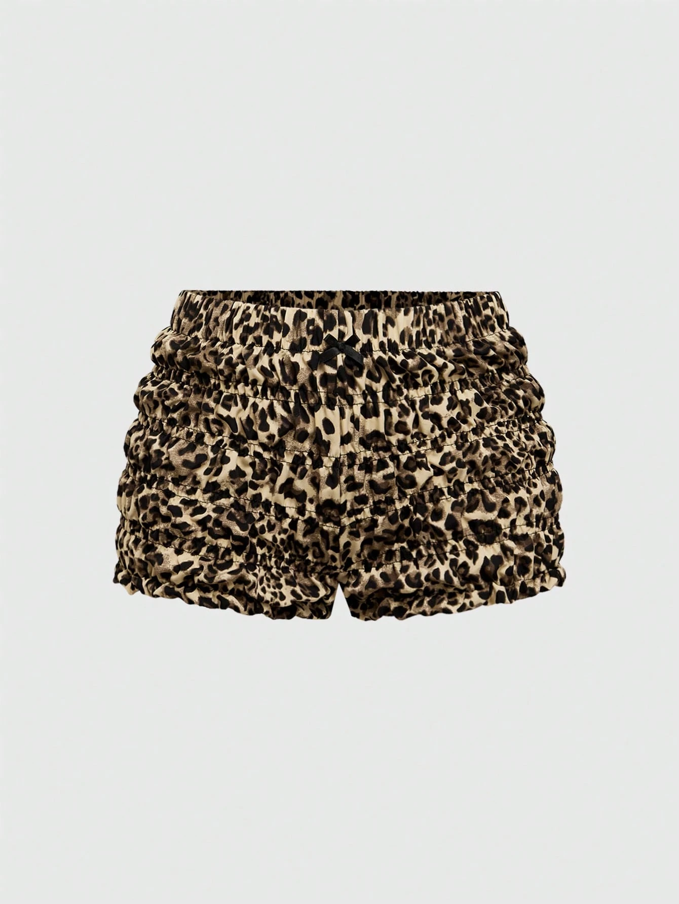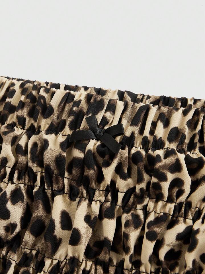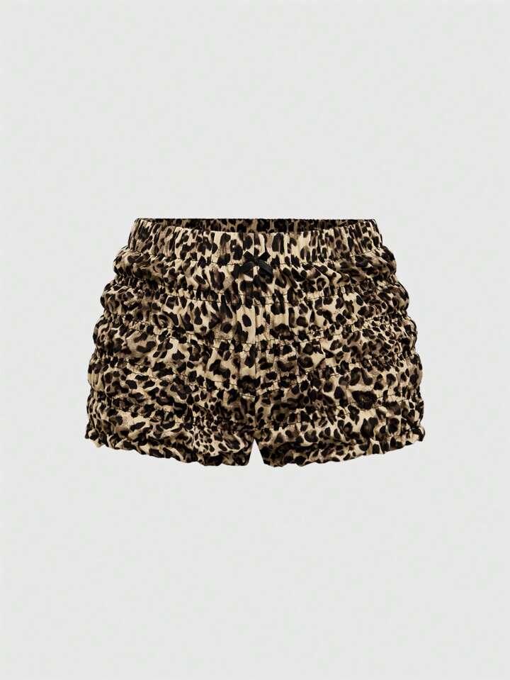 ROMWE Avant Short de mujer con detalles de volantes y estampado de leopardo con acento de lazo