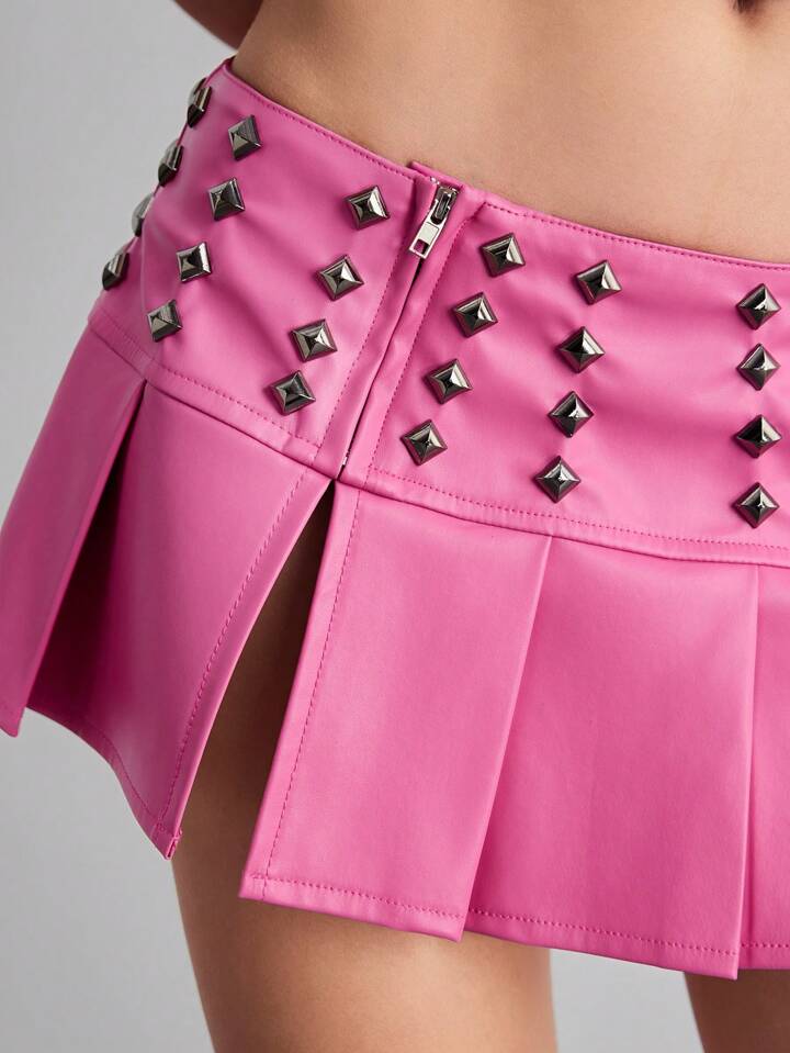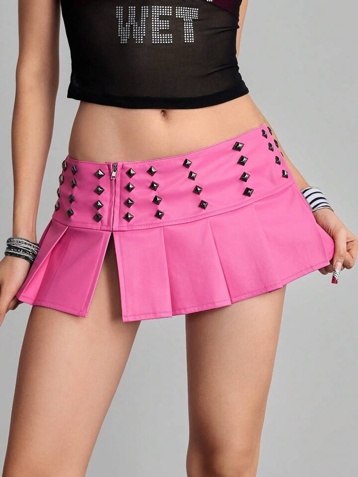 ROMWE Avant Minifalda de PU plisada de cintura baja con tachas, estilo punk rock para mujer