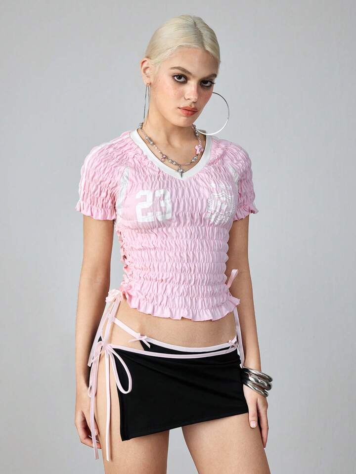 ROMWE Avant Camiseta de moda de corte corto con cuello en V, fruncido y estampado numérico para mujer