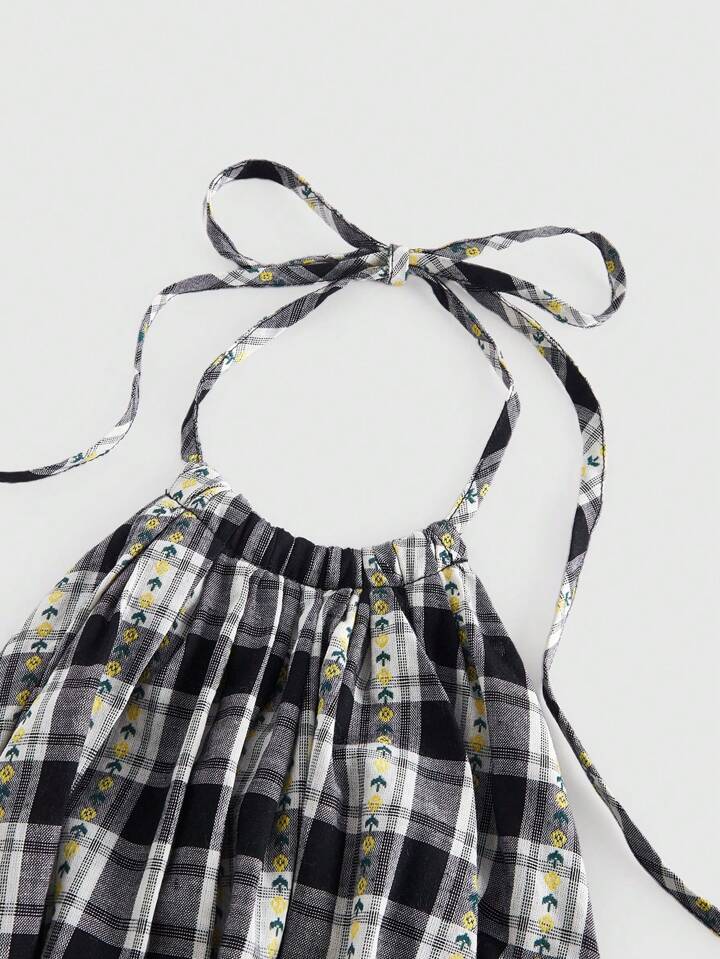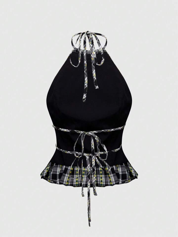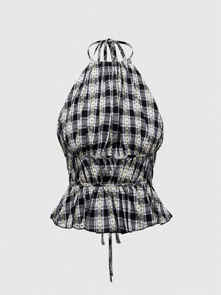 ROMWE Avant Camisola casual de mujer con cuello halter, estampado de cuadros y dobladillo con volantes