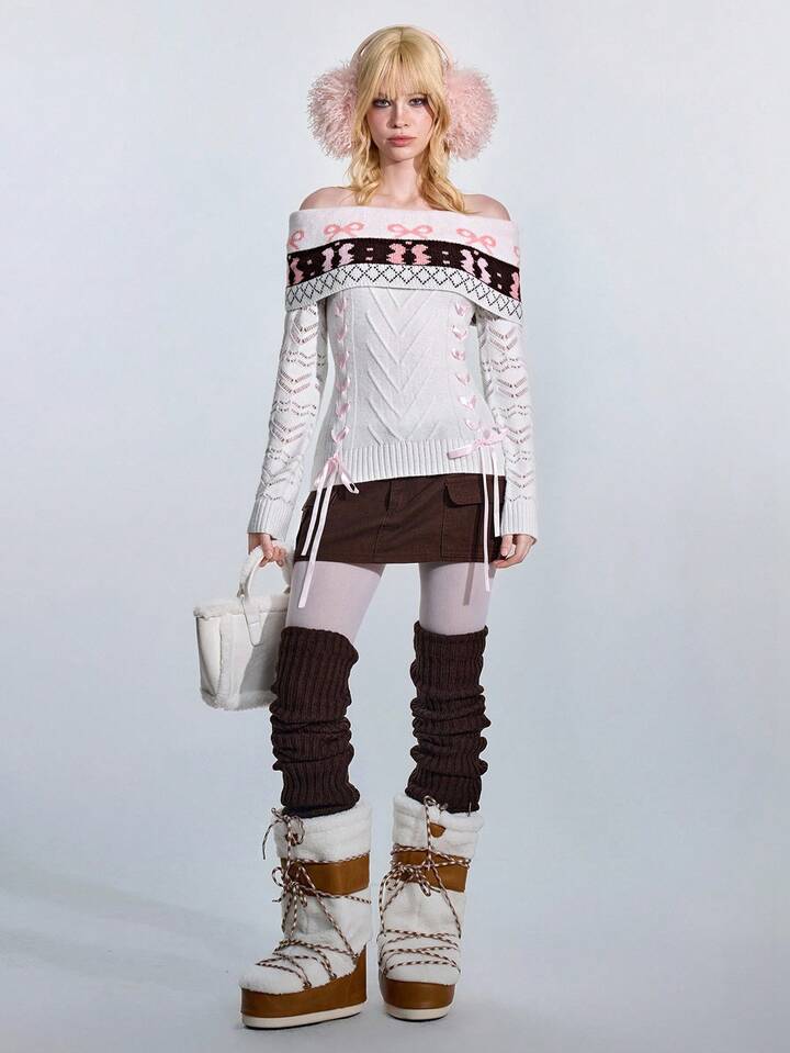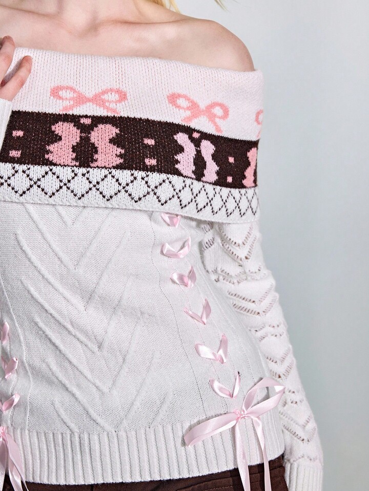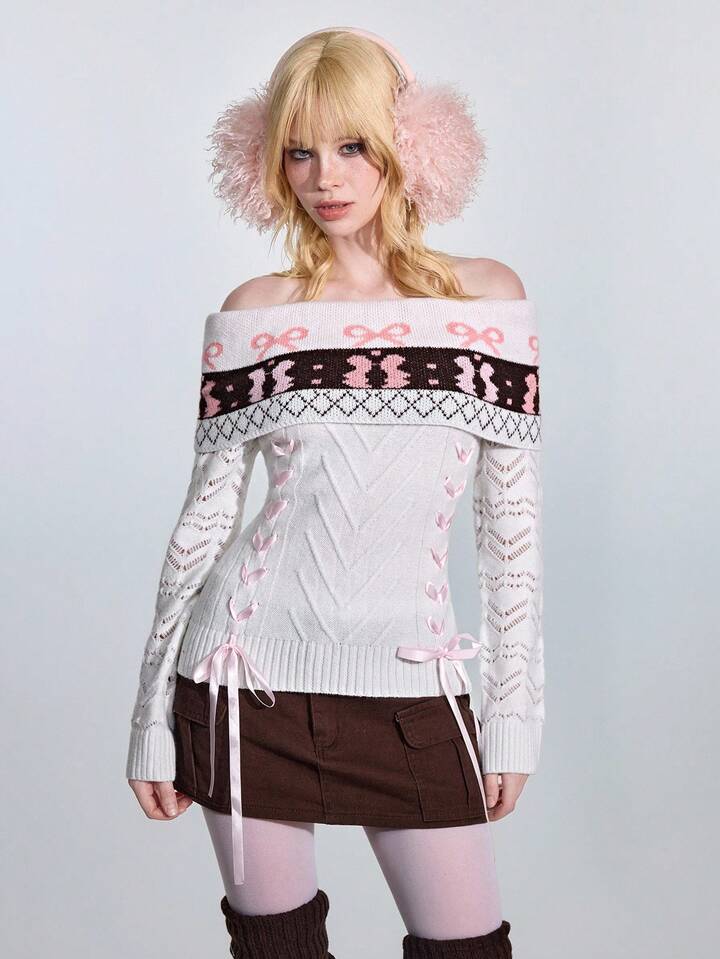 ROMWE Avant Jersey ajustado con hombros descubiertos, lazo y estampado jacquard de corazón retro minimalista y sexy para mujer