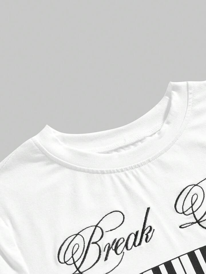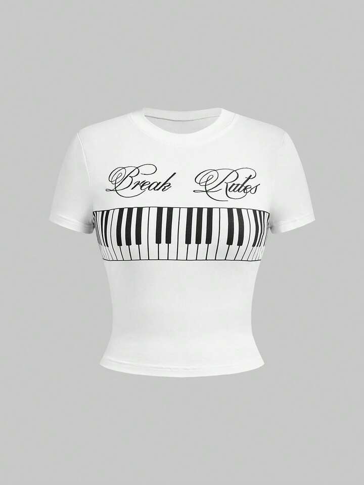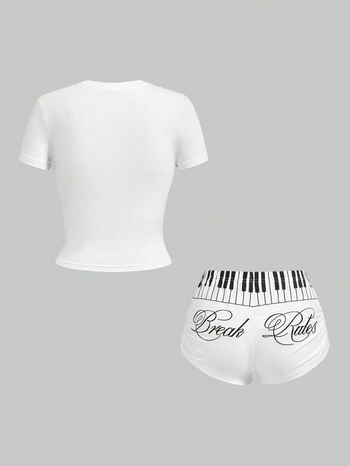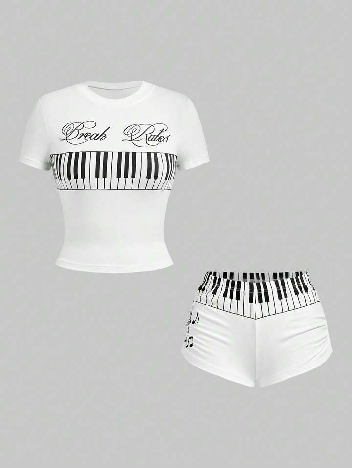 ROMWE Avant Conjunto de 2 piezas de camiseta con estampado de teclas de piano y notas musicales y mini shorts de tiro súper bajo, estilo retro Y2K sexy y versátil para mujer