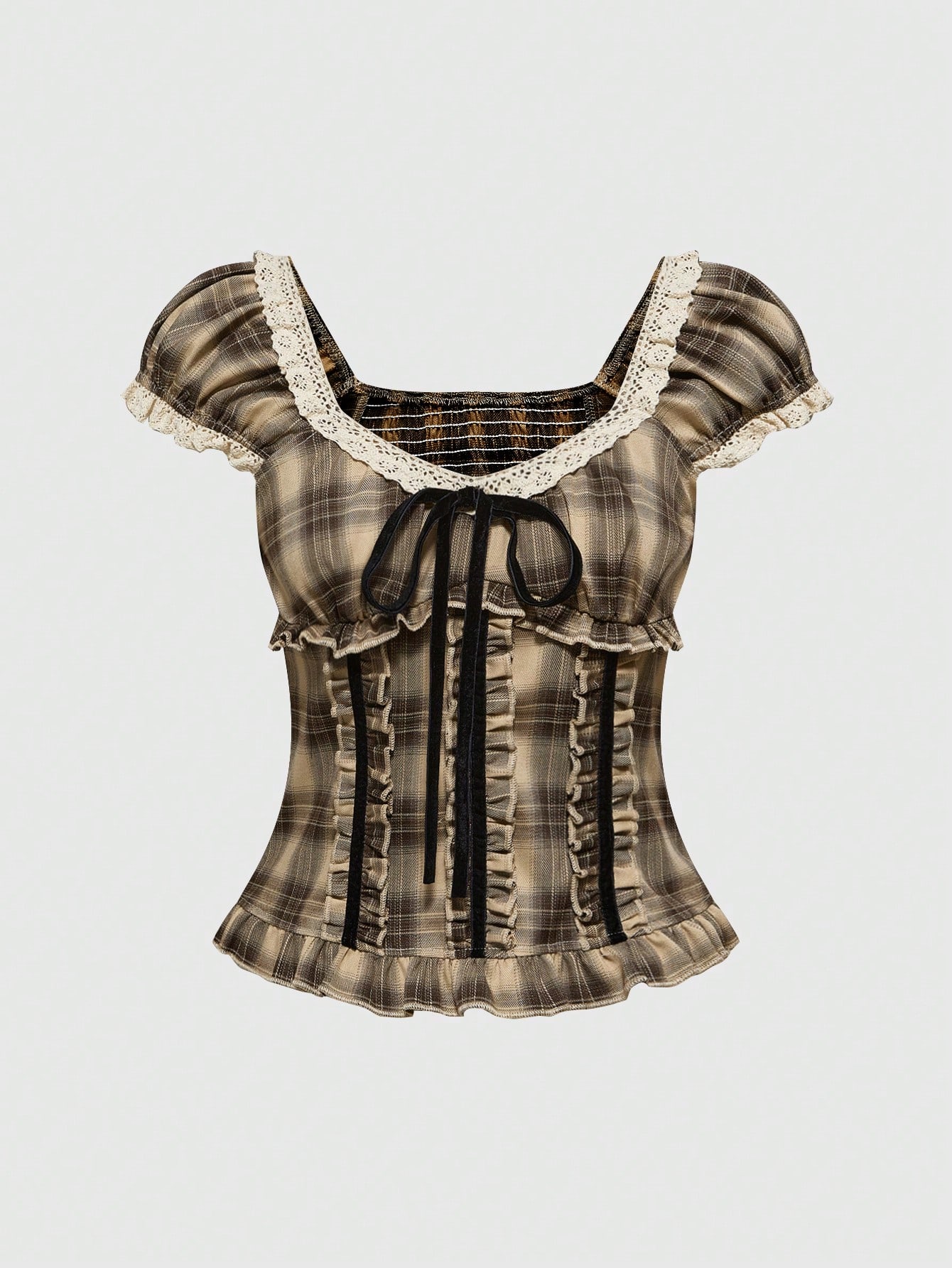 ROMWE Avant Blusa femenina con volantes en el dobladillo, manga abullonada a cuadros, cintura ceñida y encaje de contraste lindo