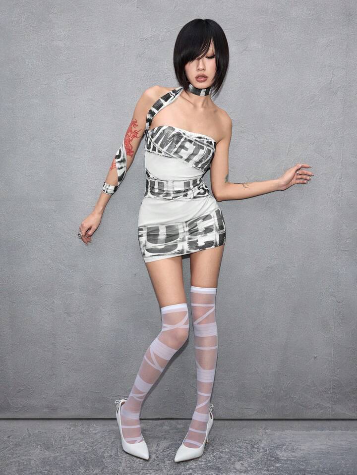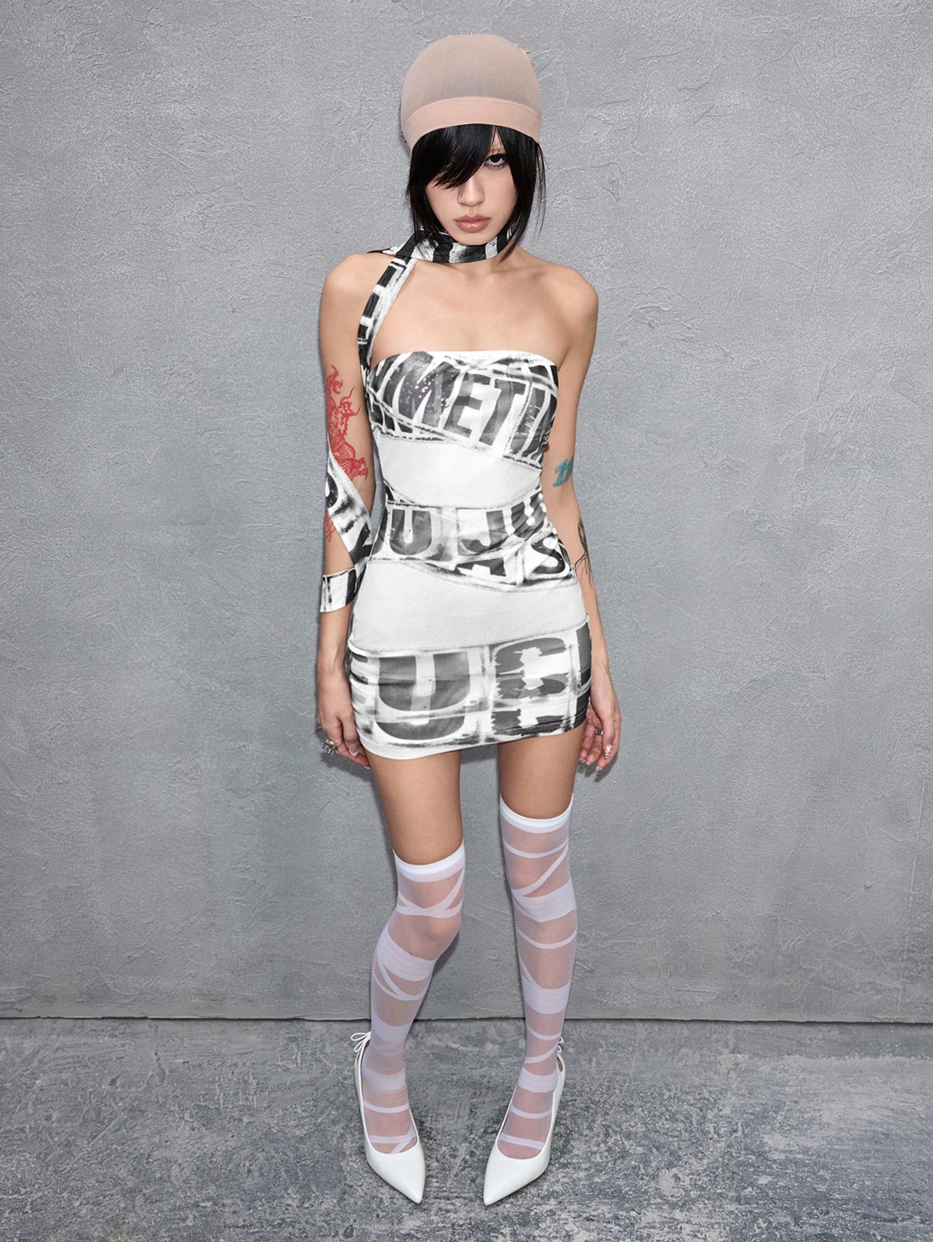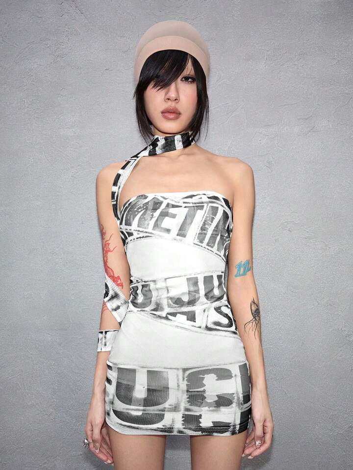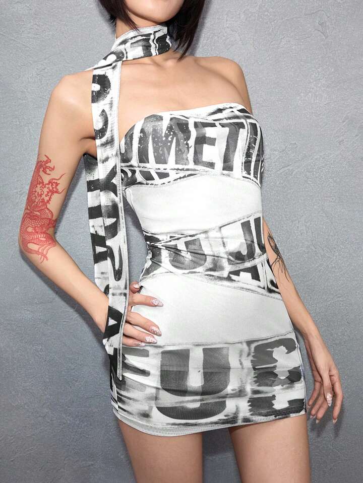 ROMWE Avant Vestido mini bandeau transparente con gráfico de logo de vanguardia sexy para mujer