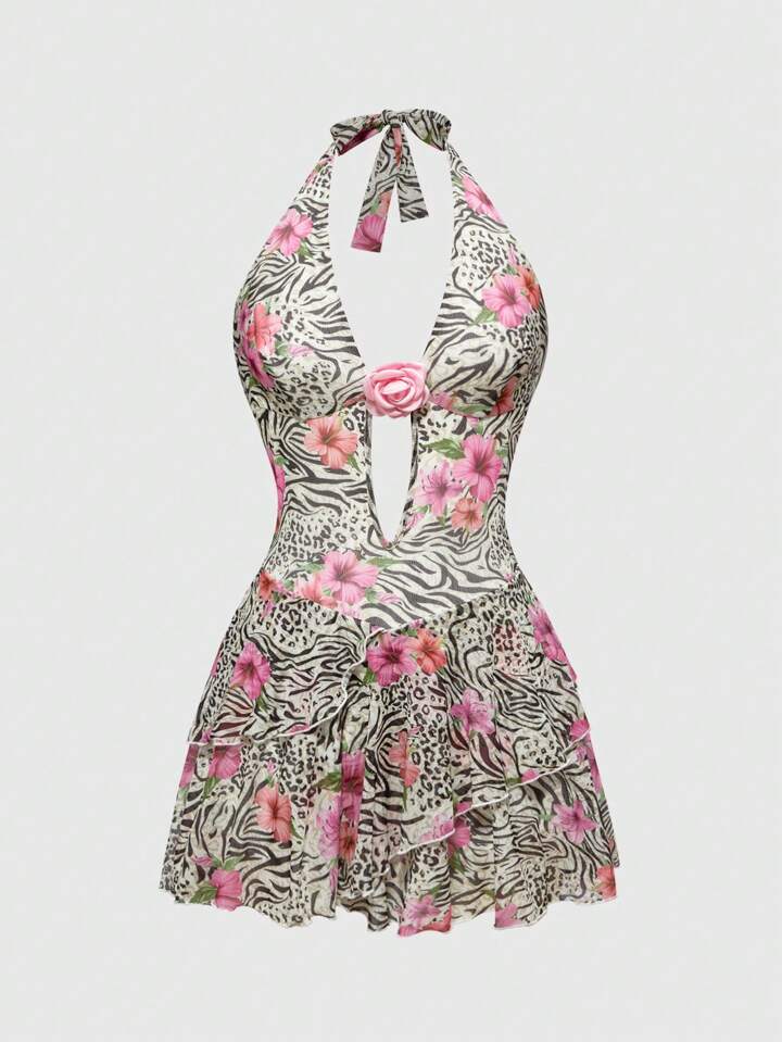 ROMWE Avant Vestido con volantes en el cuello y decoración floral 3D con estampado romántico de cebra, leopardo y flores de hibisco en estilo vacacional para mujeres