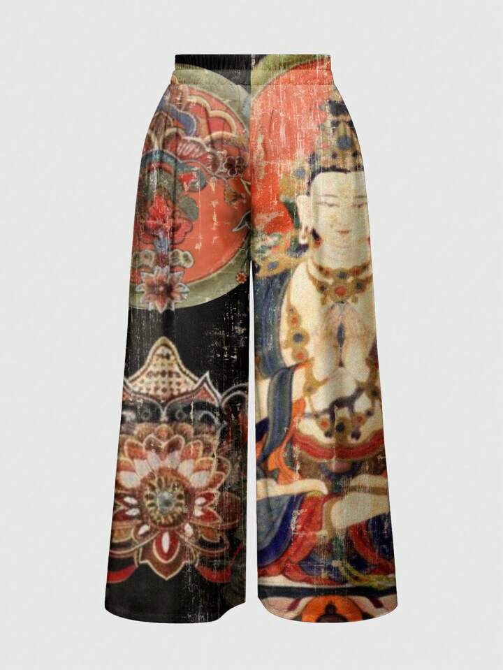 ROMWE Avant Pantalones de pierna ancha para mujer con estampado de flor de loto y budista de estilo chino