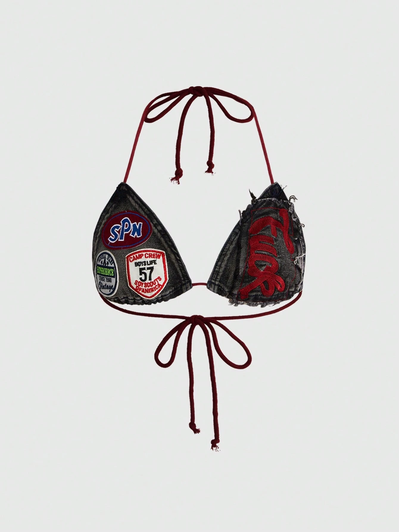 ROMWE Avant Top corto de mezclilla sexy con logotipo bordado y atar de estilo retro Y2K para mujer