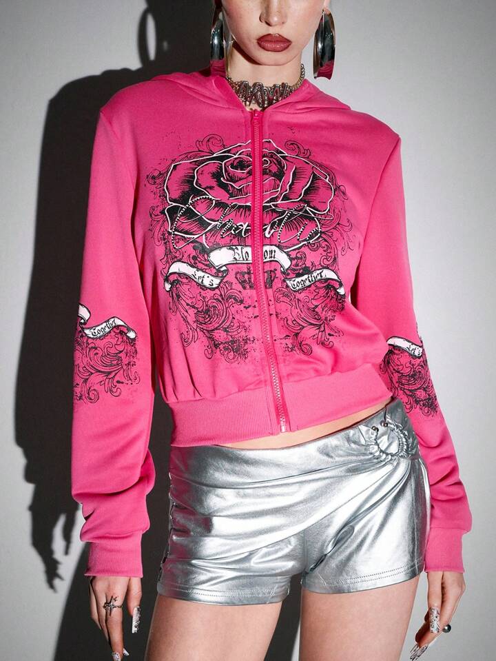 ROMWE Avant Sudadera con capucha vintage con estampado floral de rosa, adornada con rhinestones y con corte corto, estilo Y2K