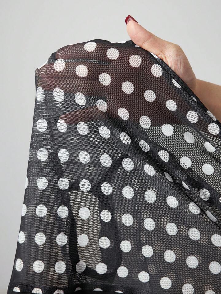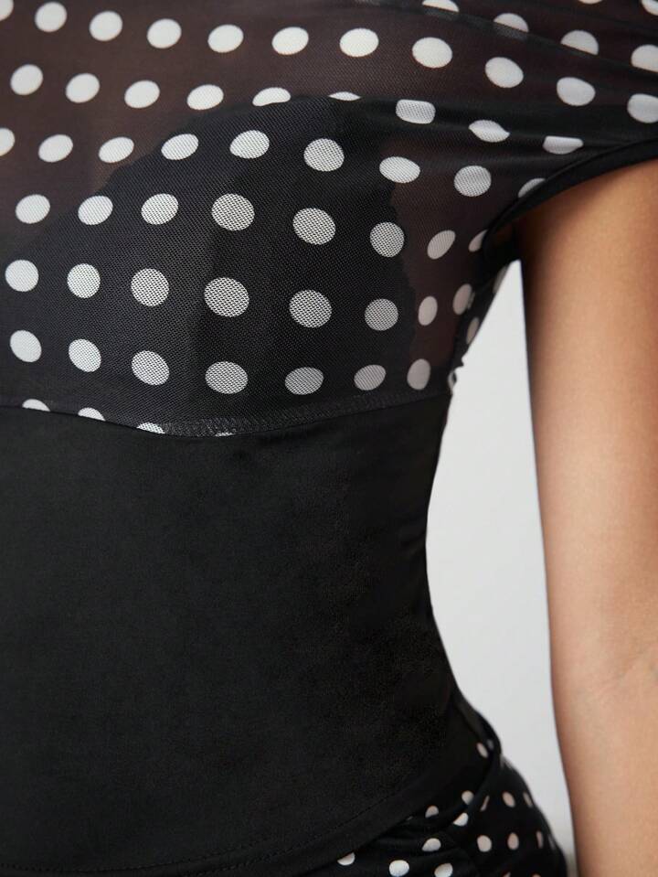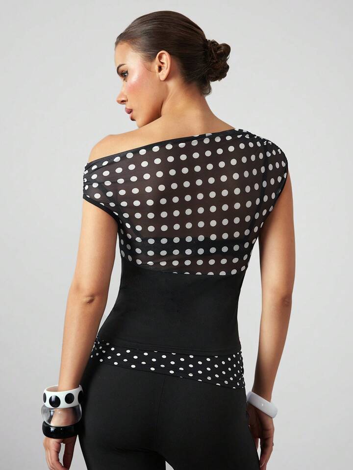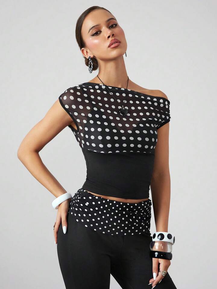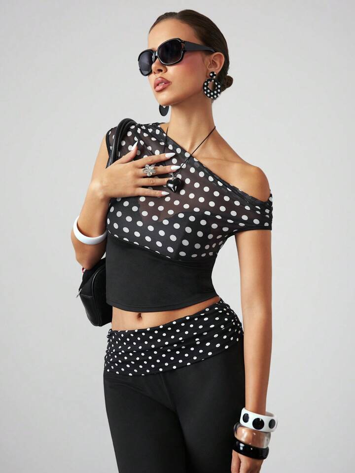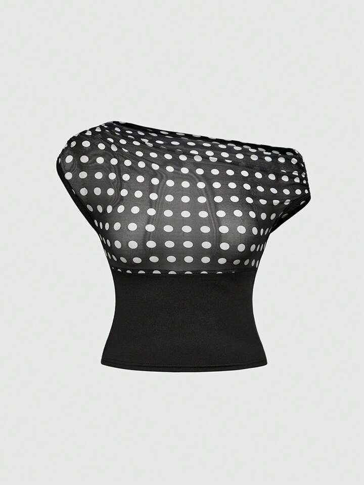 ROMWE Avant Camiseta de mujer ajustada con hombro asimétrico y volantes, en estilo retro Y2K Harajuku con lunares