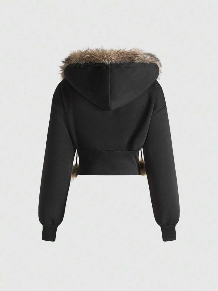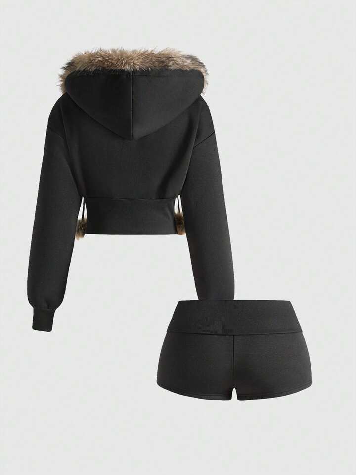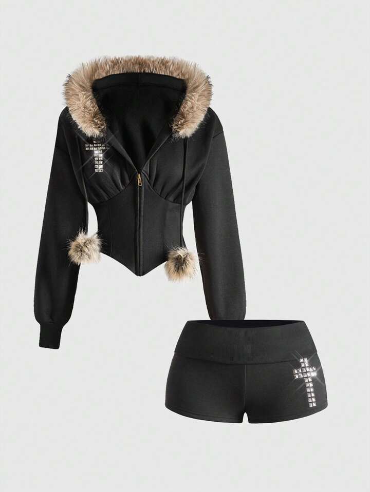 ROMWE Avant Conjunto de sudadera con capucha y pantalones de terciopelo con parches de strass estilo Y2K y K-pop para mujer, otoño/invierno
