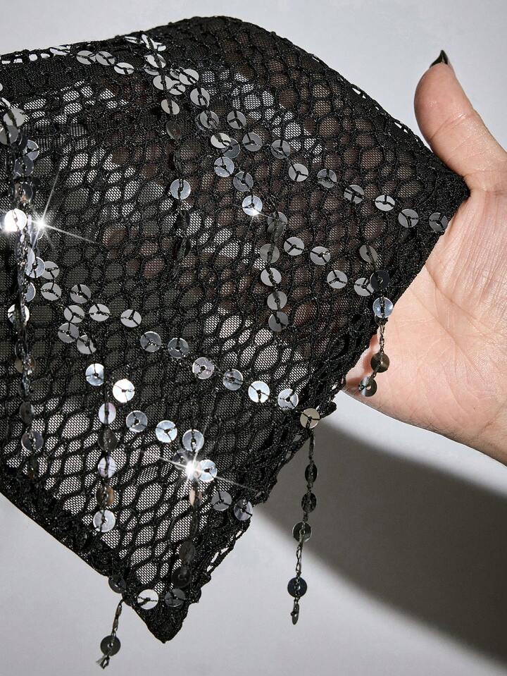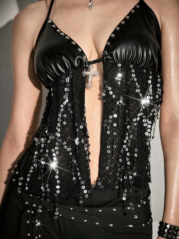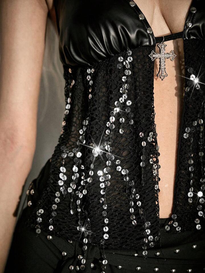 ROMWE Avant Top sin espalda de mujer con colgante de cruz metálica, parches de PU y red de pesca con cuentas, para festival de música rave Y2K