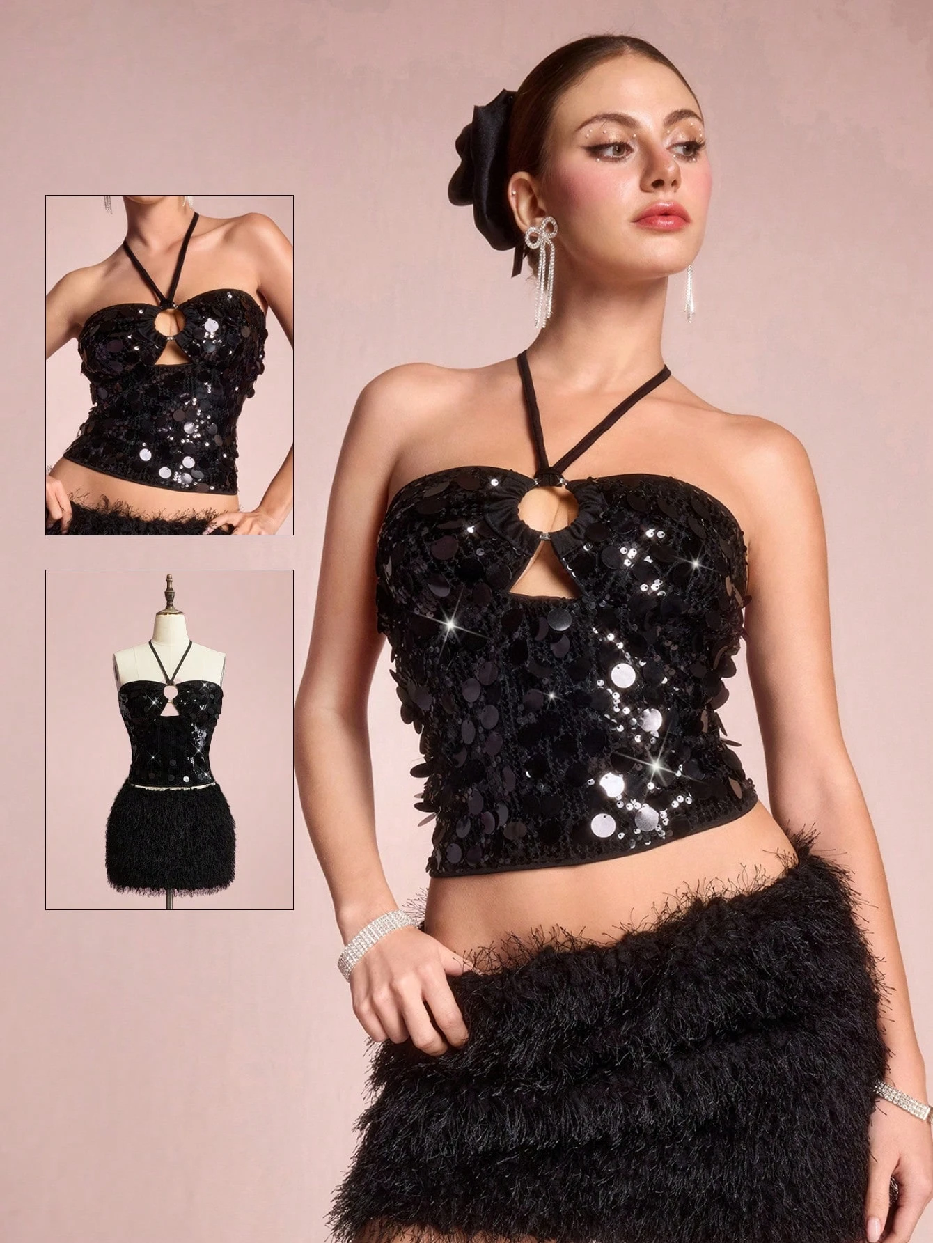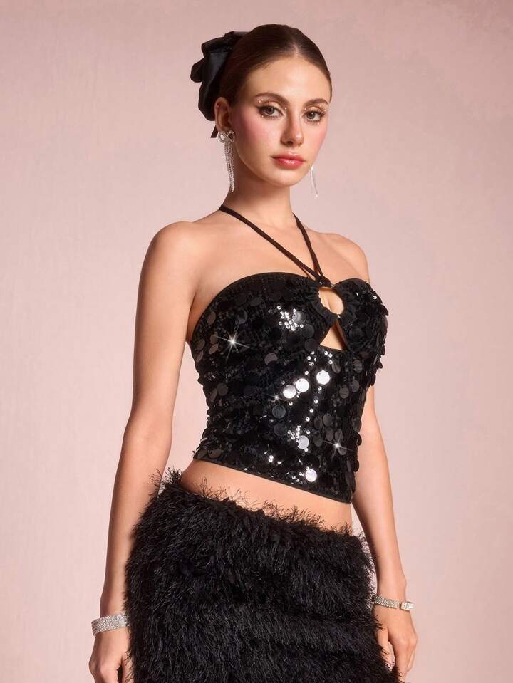 ROMWE Avant Top ajustado para mujer con cuello de halter brillante y con lentejuelas, estilo clubwear Y2K