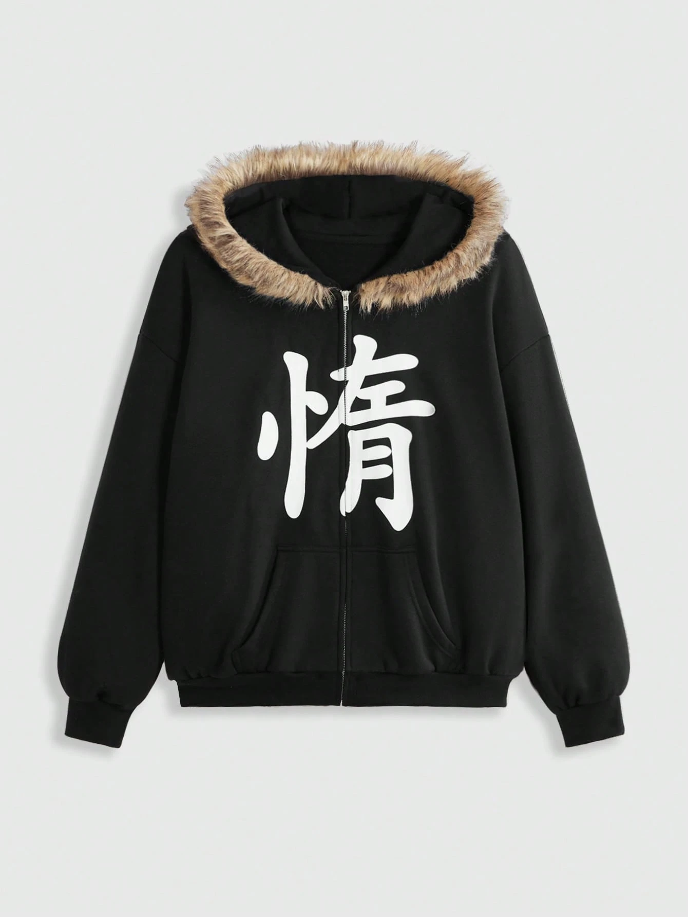 ROMWE Avant Sudadera holgada con capucha de estilo Y2K Streetwear con estampado de caracteres chinos Logan y parches