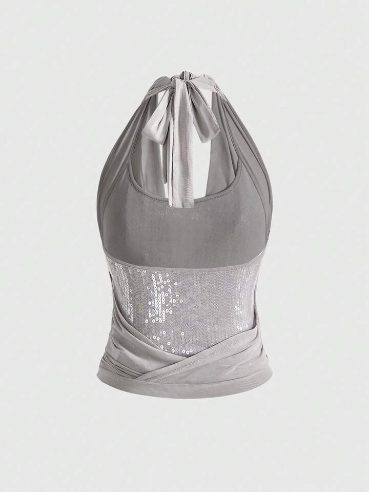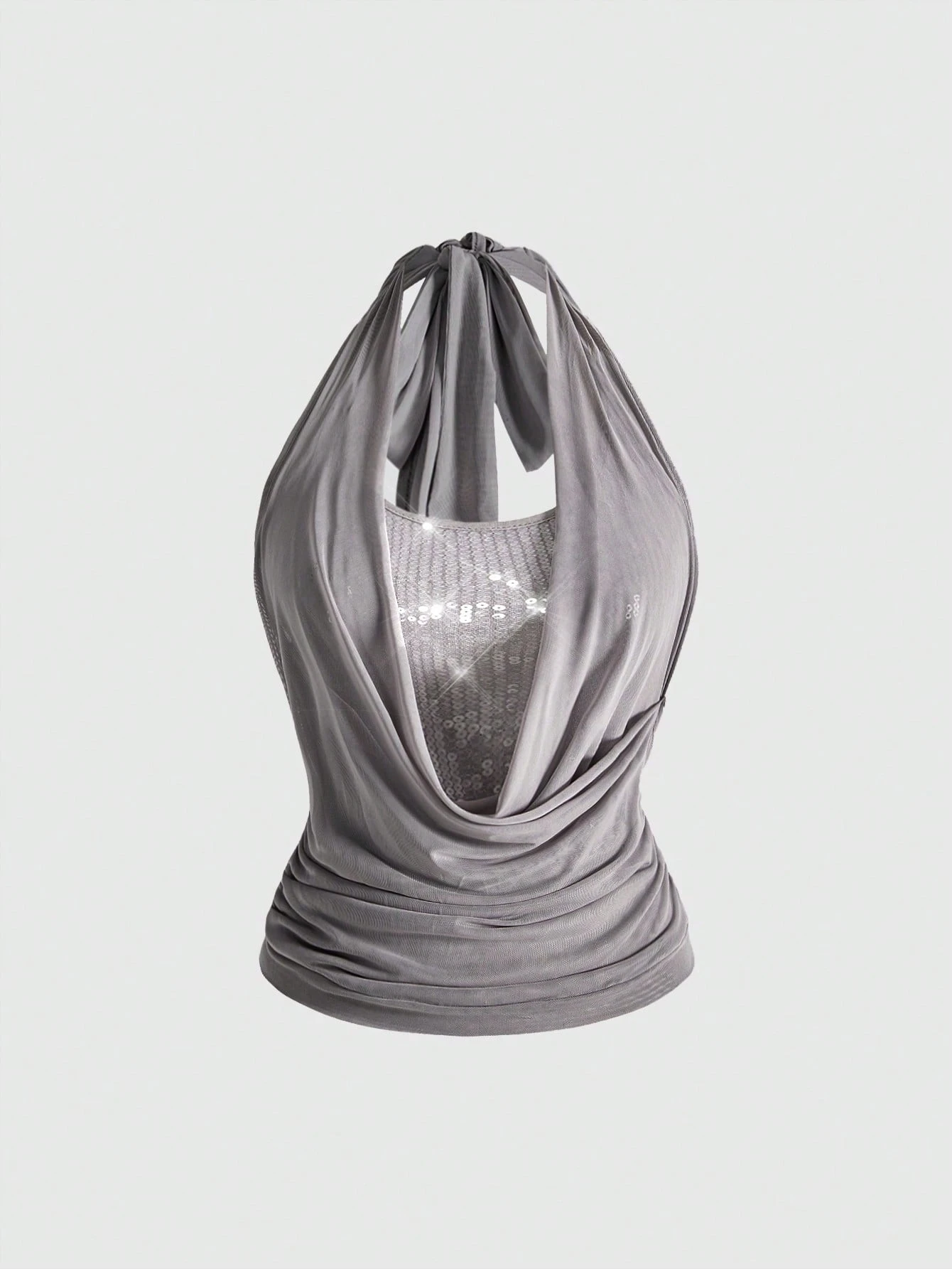 ROMWE Avant Top halter con cuello profundo drapeado, espalda descubierta y forro de camiseta, con lentejuelas, estilo callejero