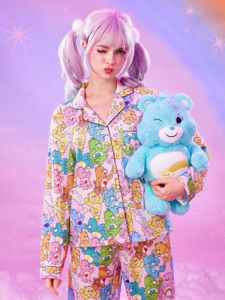 ROMWE X Care Bears Conjunto de pijama cómodo para otoño/invierno con estampado de osos de dibujos animados, cuello con solapa y manga larga