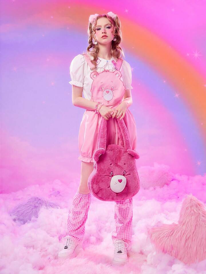 ROMWE X Care Bears Bolso de hombro mullido, suave, esponjoso y lindo con diseño de oso de dibujos animados para niñas, mujeres, estudiantes universitarias, principiantes y trabajadores de oficina para trabajo, oficina, transporte, para otoño e invierno, invierno cálido, elegante bolso grande, mejores ideas de inspiración para el otoño