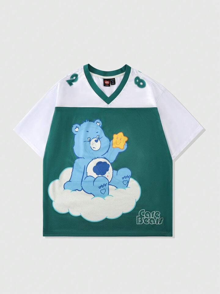 ROMWE X Care Bears Camiseta deportiva para hombres, de manga corta, camiseta atlética, panel de tela de malla con detalles brillantes
