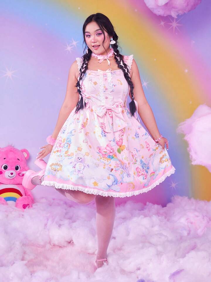 ROMWE X Care Bears Talla grande Vestido con estampado de dibujos animados ribete con encaje con lazo delantero