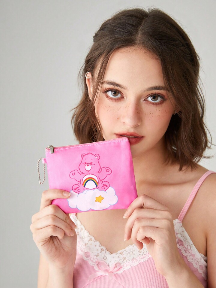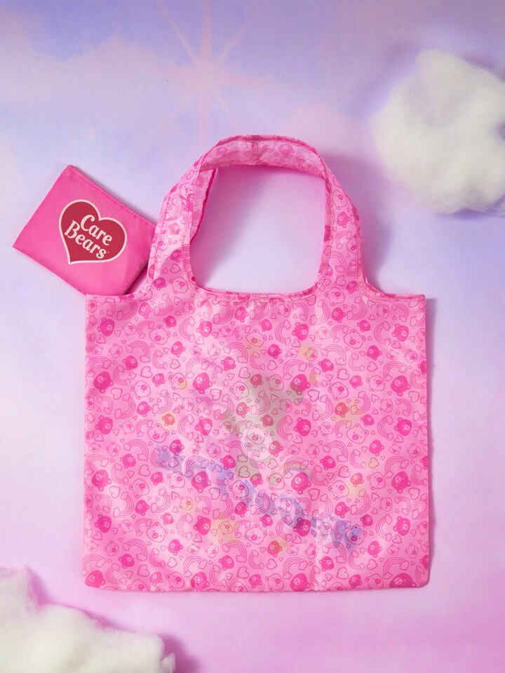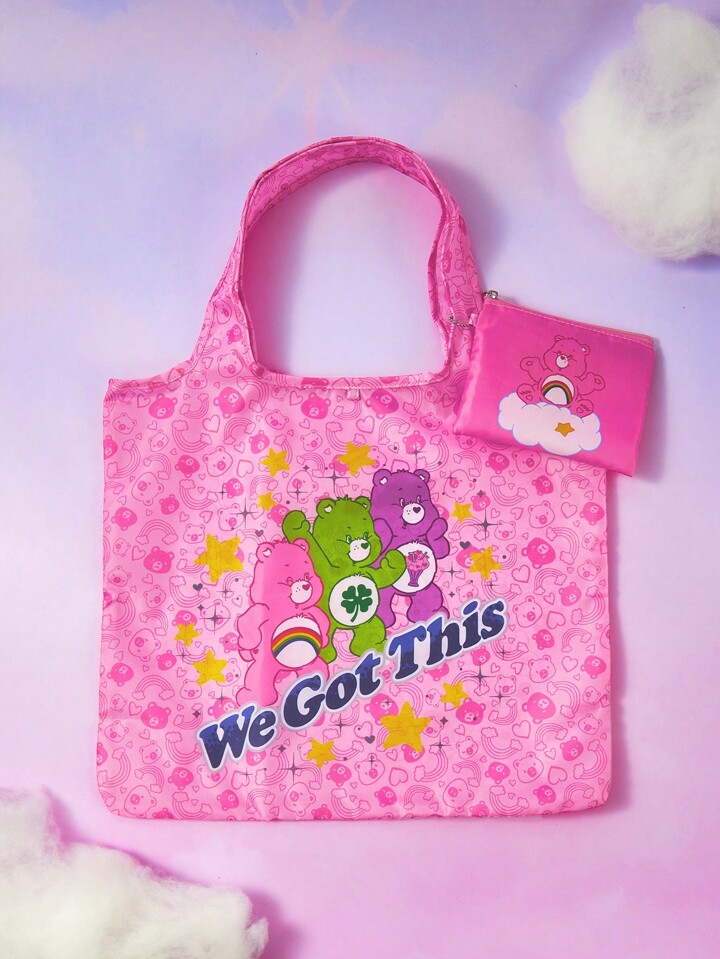 ROMWE X Care Bears Bolso de compras pequeño con monedero estampado de dibujos animados con eslogan lindo rosa