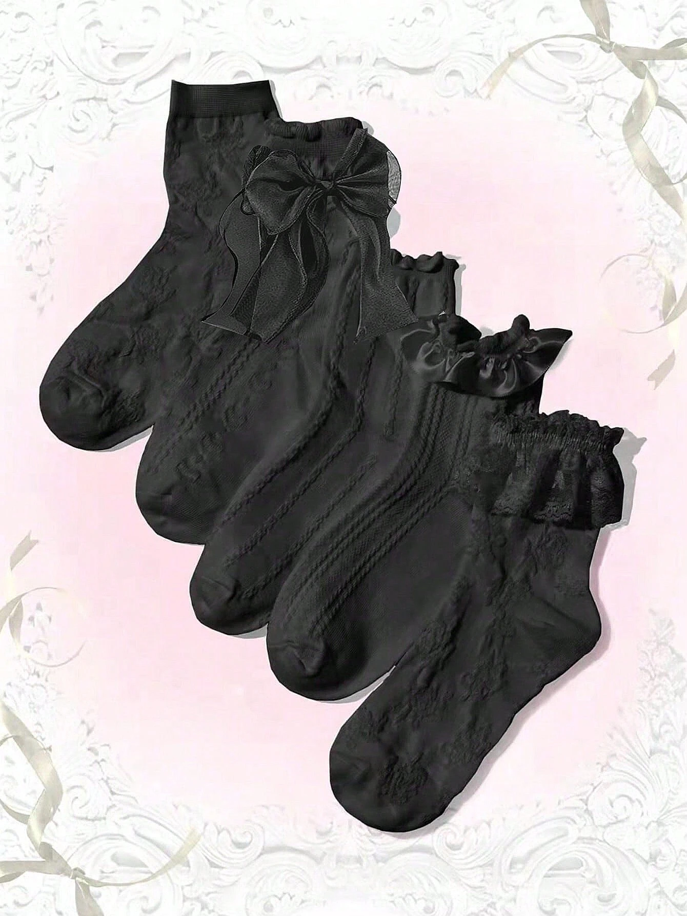 Mujer 3 pares Calcetines de tripulación al azar unicolor con diseño de lazo fruncido