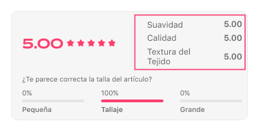 Para algunos productos, proporcionamos atributos para calificar desde múltiples puntos de vista para que el producto sea valorado de manera más fácil y precisa. Se pueden calificar los productos según la calidad del producto, la transpirabilidad, la suavidad, la facilidad de uso y otros aspectos; calcularemos las calificaciones promedio de todos los usuarios. La puntuación total es 5.