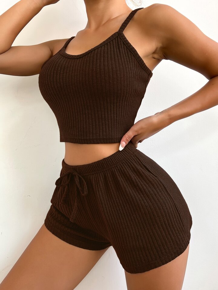 Conjunto de pantalón corto y top tipo camiseta de punto acanalado con lazo en la cintura para usar en casa