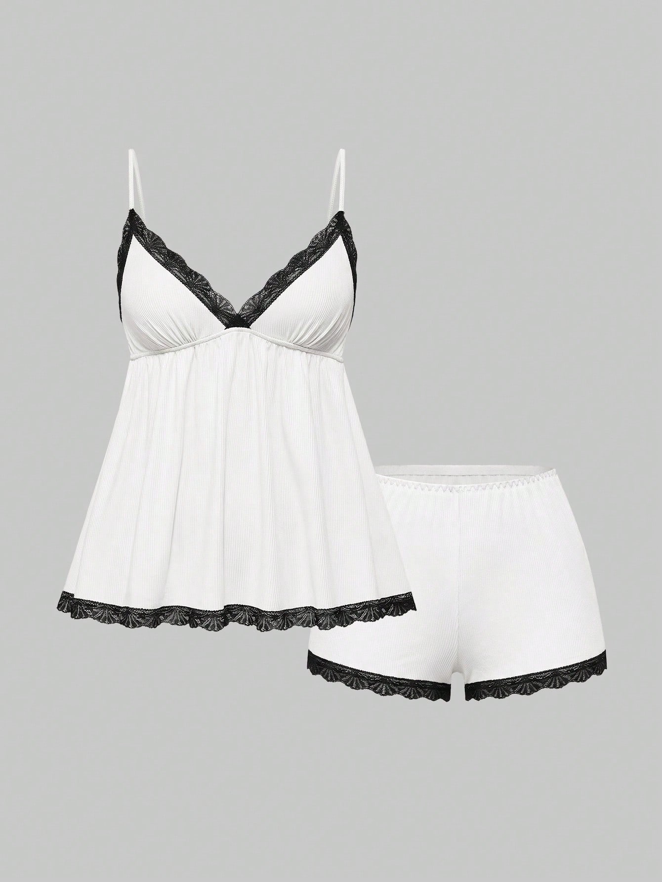 Conjunto de pijama casual de camiseta de tirantes con encaje acanalado y pantalones cortos