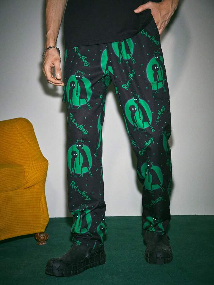 Rick and Morty | ROMWE Pantalones Laterales De Bolsillo Con Solapa Con Cordón En La Cintura, Gráficos De Letras Y Dibujos Animados Para Hombre