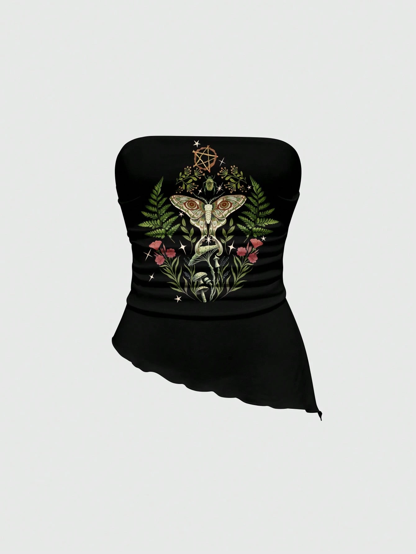 Goth Blusa asimétrica de hombro con estampado de mariposa, hoja y polilla romántica gótica para mujer, /verano