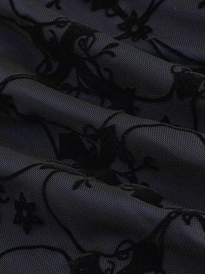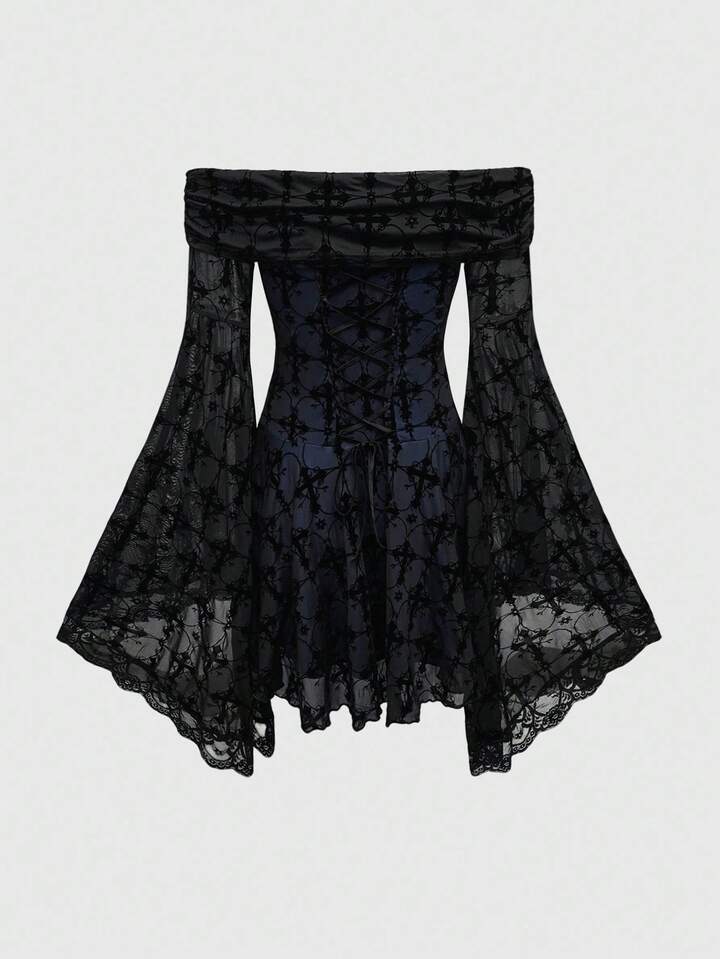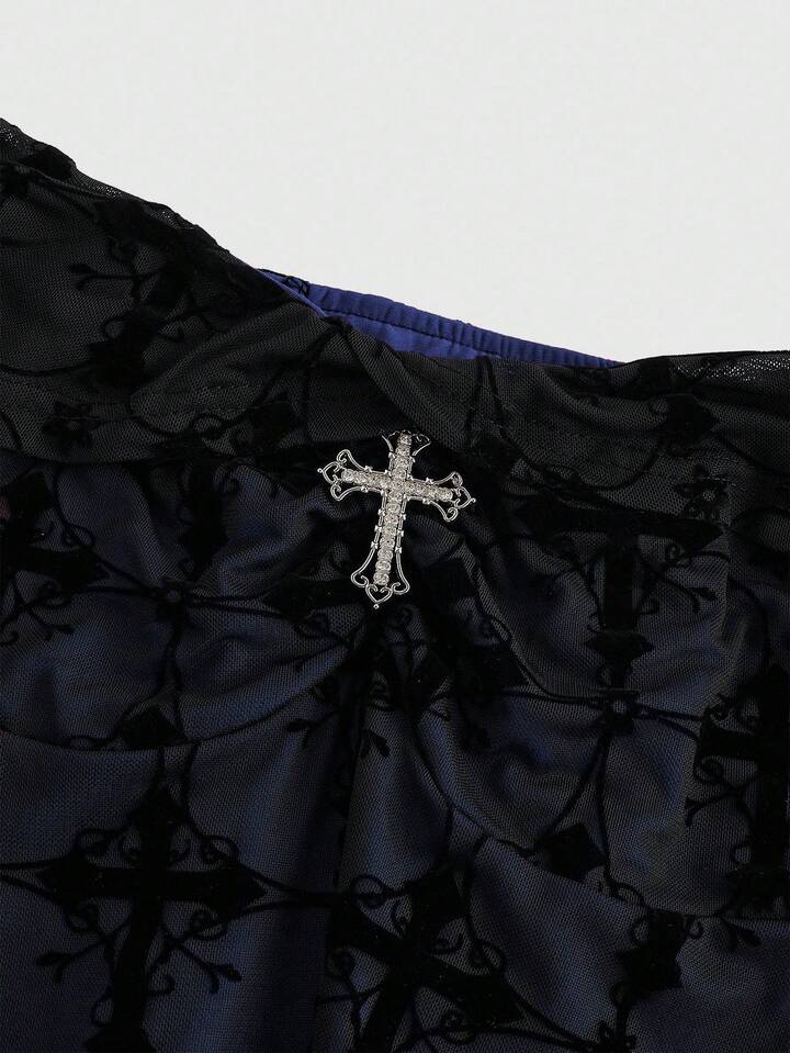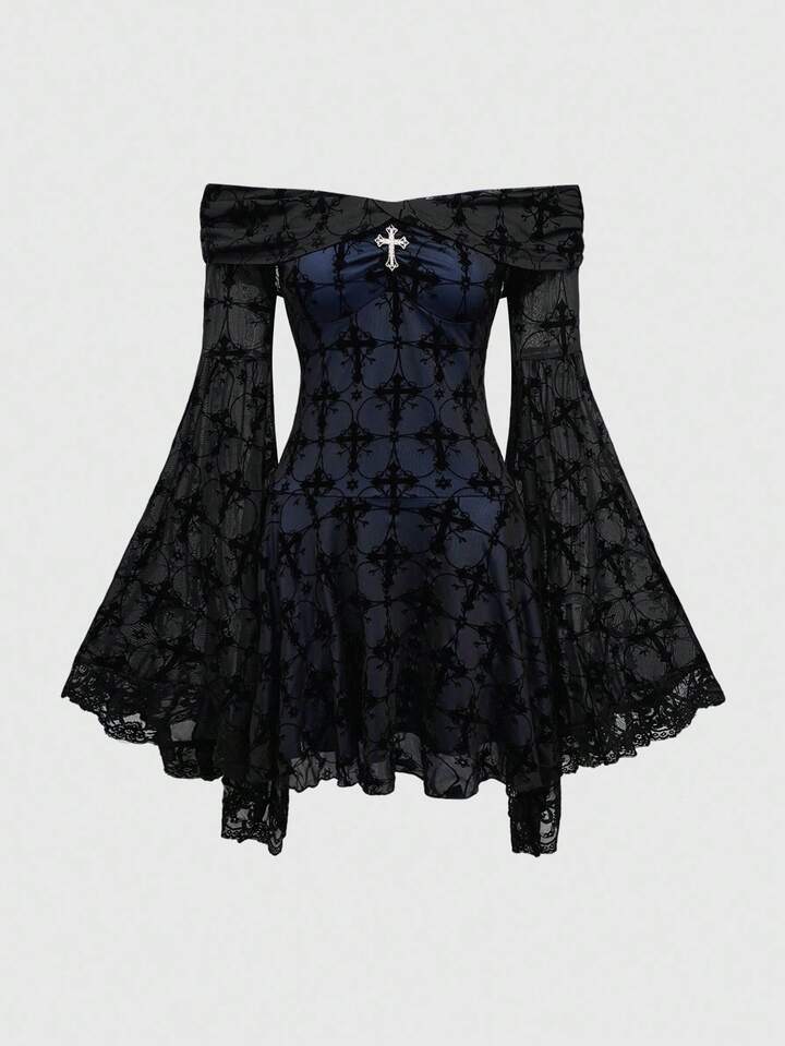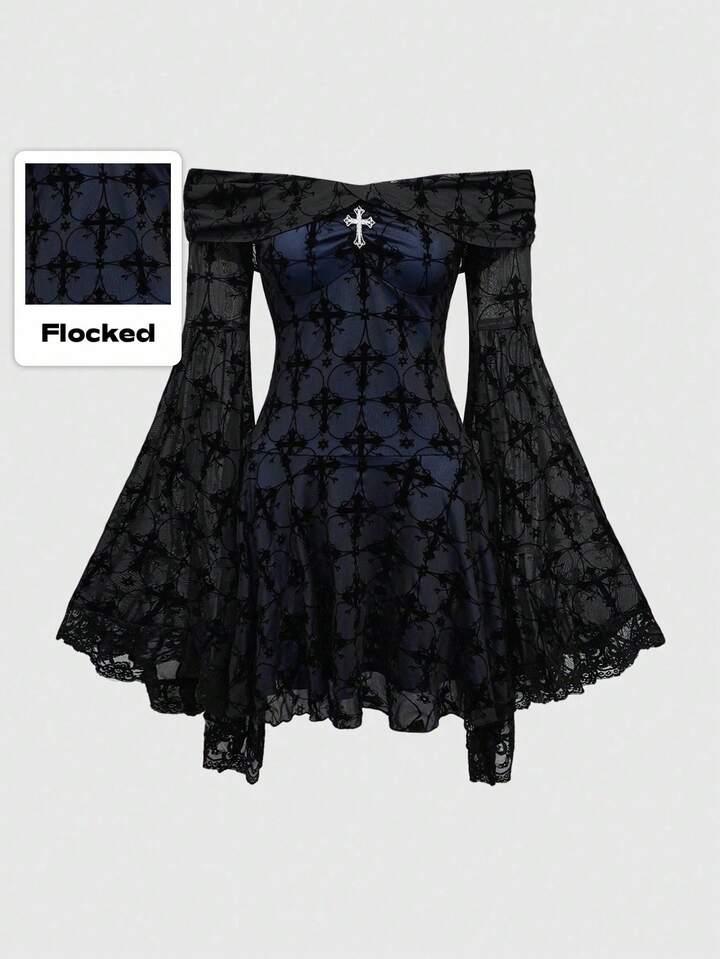 Goth Vestido romántico de hombros descubiertos con estampado retro de cruz gótica de palacio