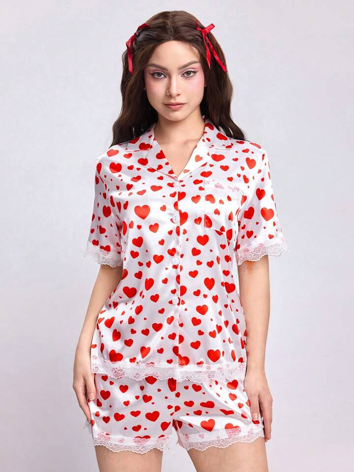 Conjunto de pijama con cuello de solapa, manga corta y pantalón corto, con estampado de corazones de satén y parches de encaje, romántico para el Día de San Valentín
