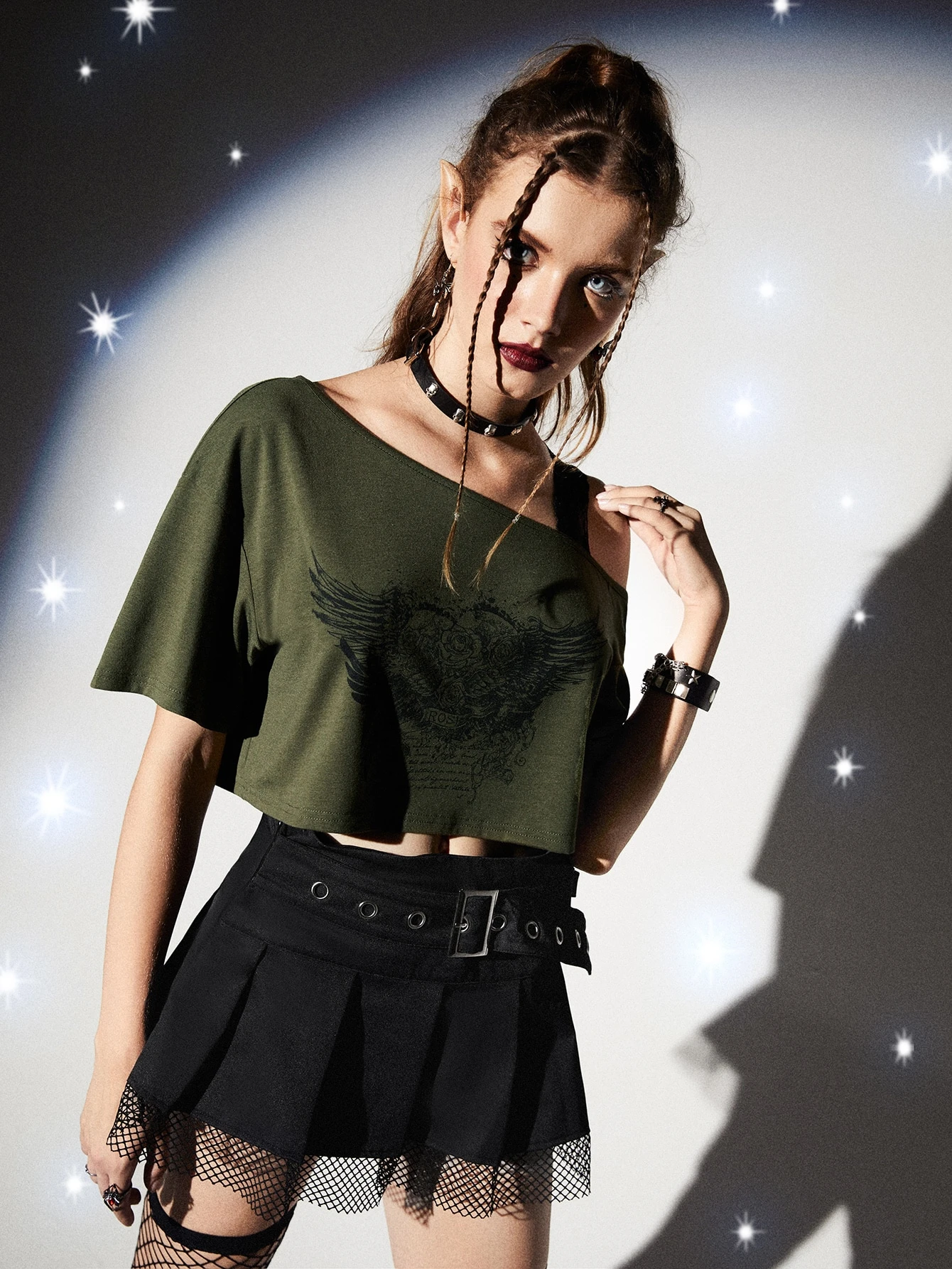 Camiseta corta rosa & con estampado de ala con encaje en contraste