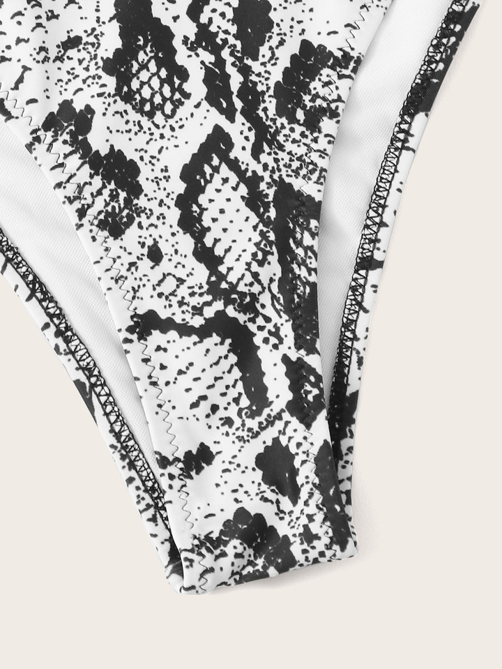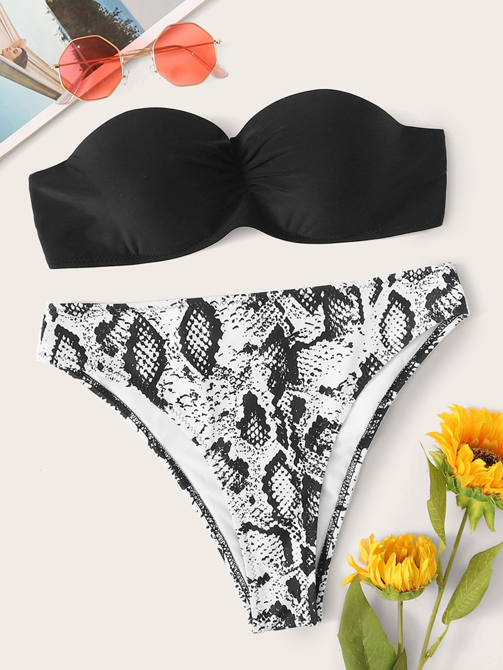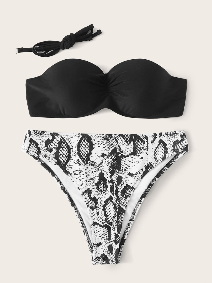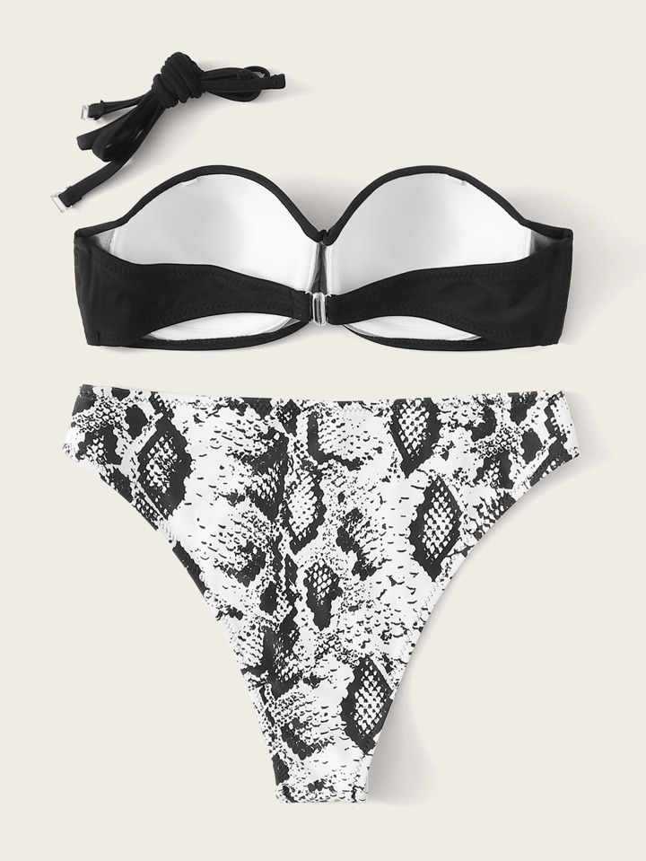 Conjunto de bikini con top bandeau con aros y Bottom con estampado de piel de serpiente y pliegues