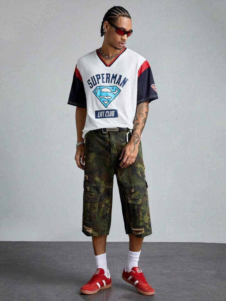 SUPERMAN X ROMWE Camiseta gráfica de manga corta con bloque de color informal para hombre, verano