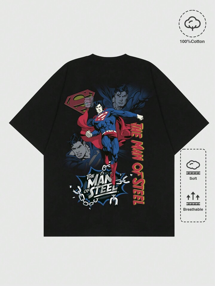 SUPERMAN X ROMWE Camiseta de manga corta casual de verano con personajes de anime y letras impresas para hombres