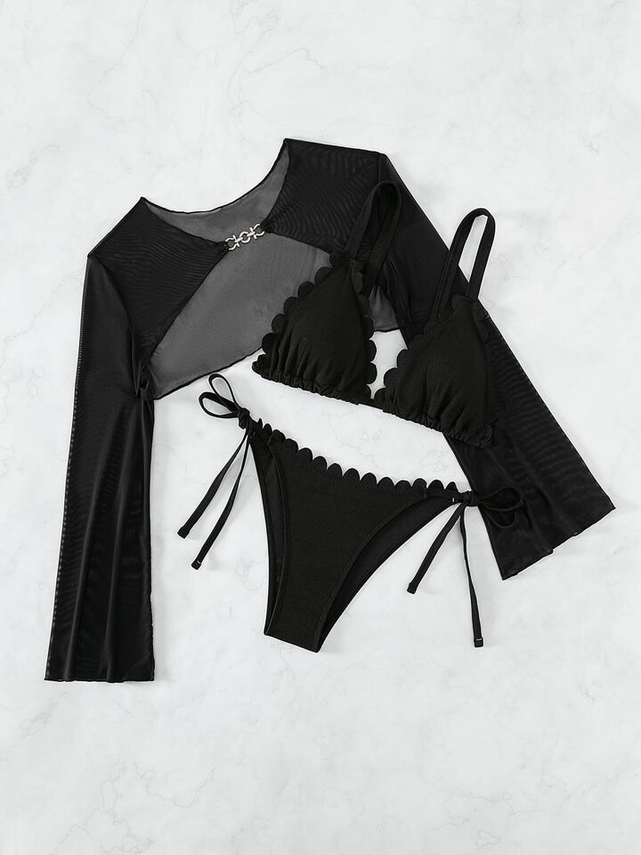 Conjunto de bikini de verano de playa con triángulo de escote halter y ribete de borde de concha con cubierta
