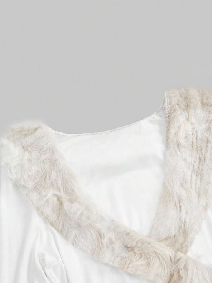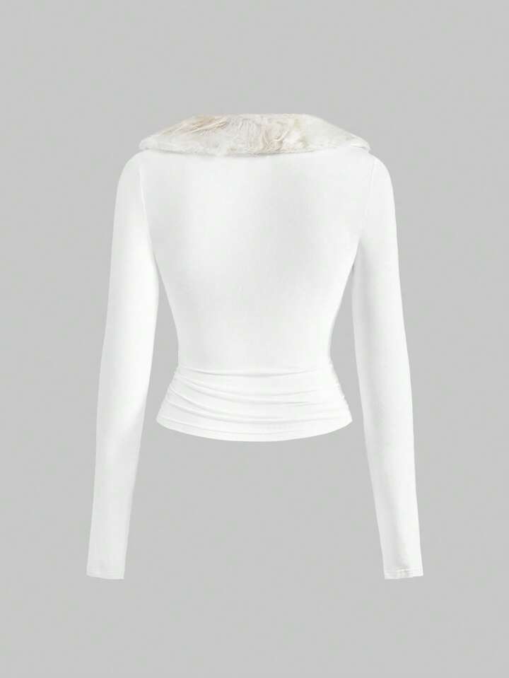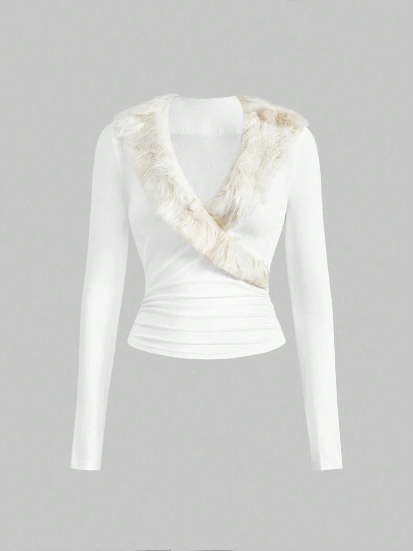 Camiseta de mujer con escote profundo en V, parches de piel y drapeado